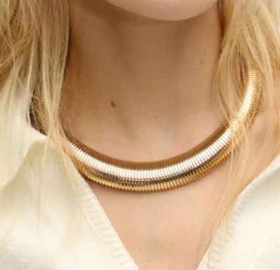 Let this be your hero piece—wear it with a deep-V blouse, a strapless top, or even layered over a turtleneck. Alicia loves pairing it with the Cobra Stretch Bracelet for a high-glam, everyday gold look.