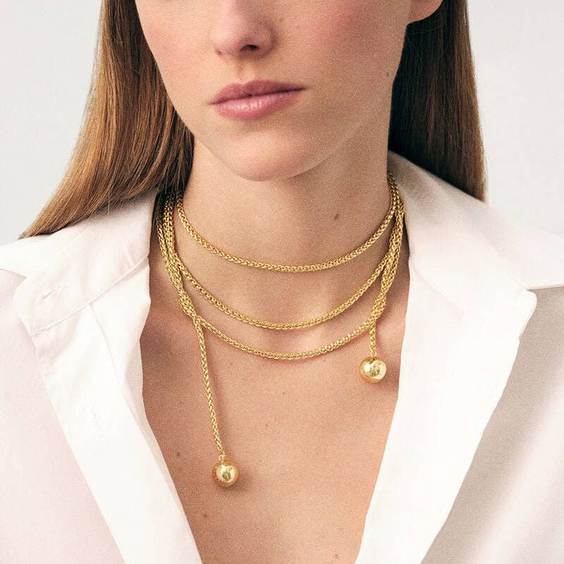 Meet — the long lariat necklace that adds just the right touch of drama and shine ✨ Crafted in gold-plated stainless steel, this piece features a sleek ball chain design finished with rope tassel ends that move with you. It’s bold yet refined — the kind of effortless statement that instantly pulls an outfit together.