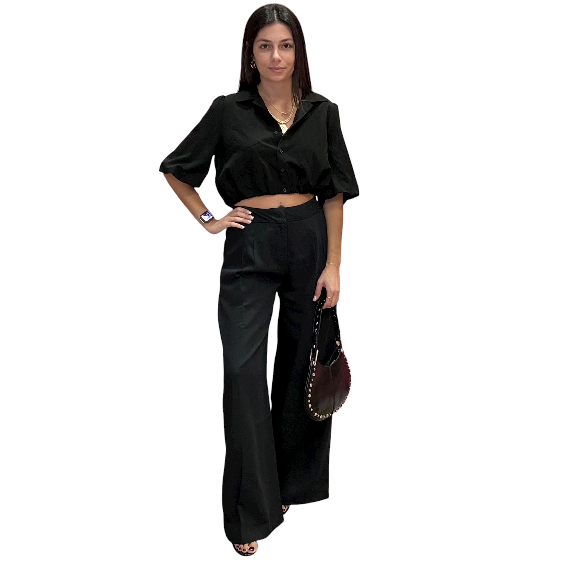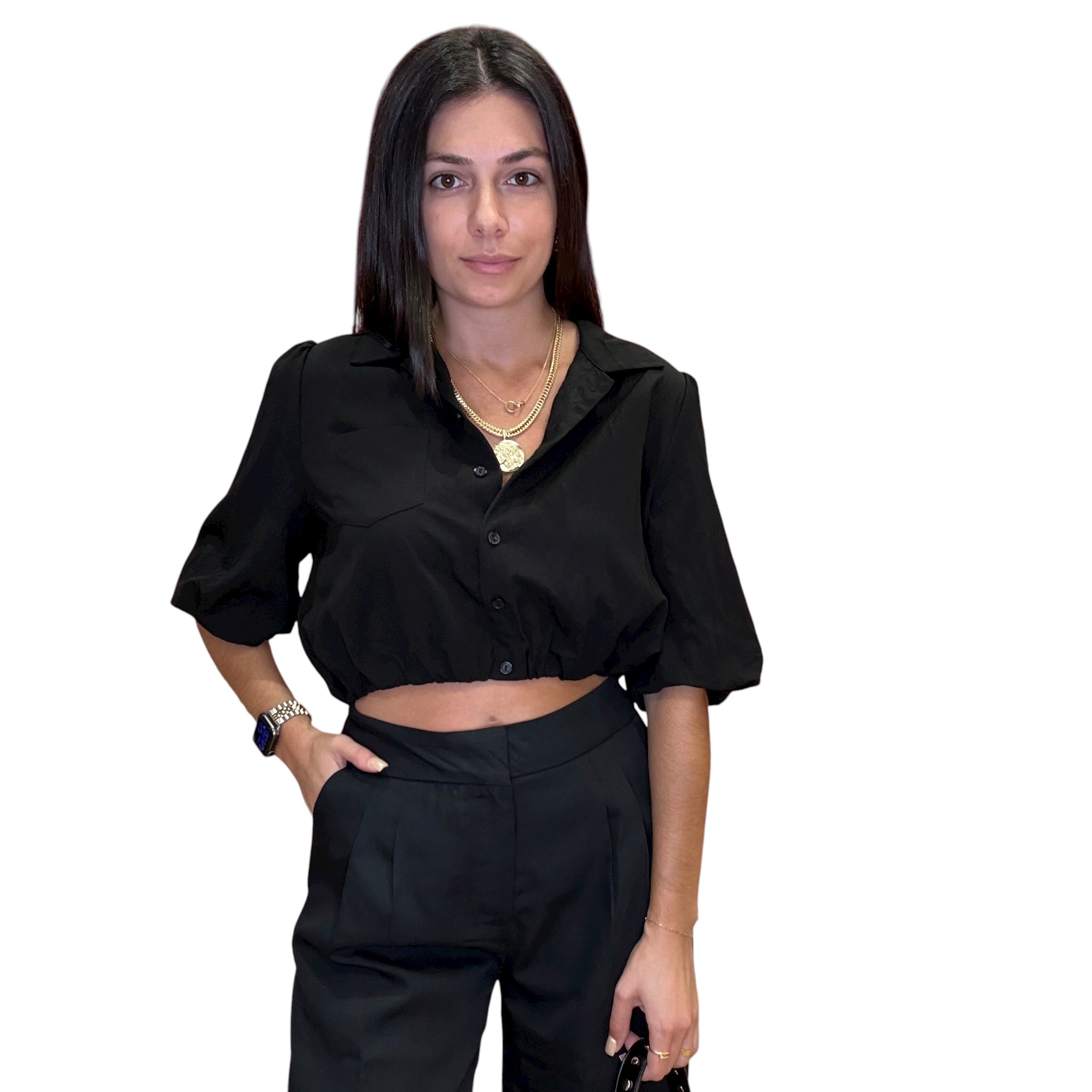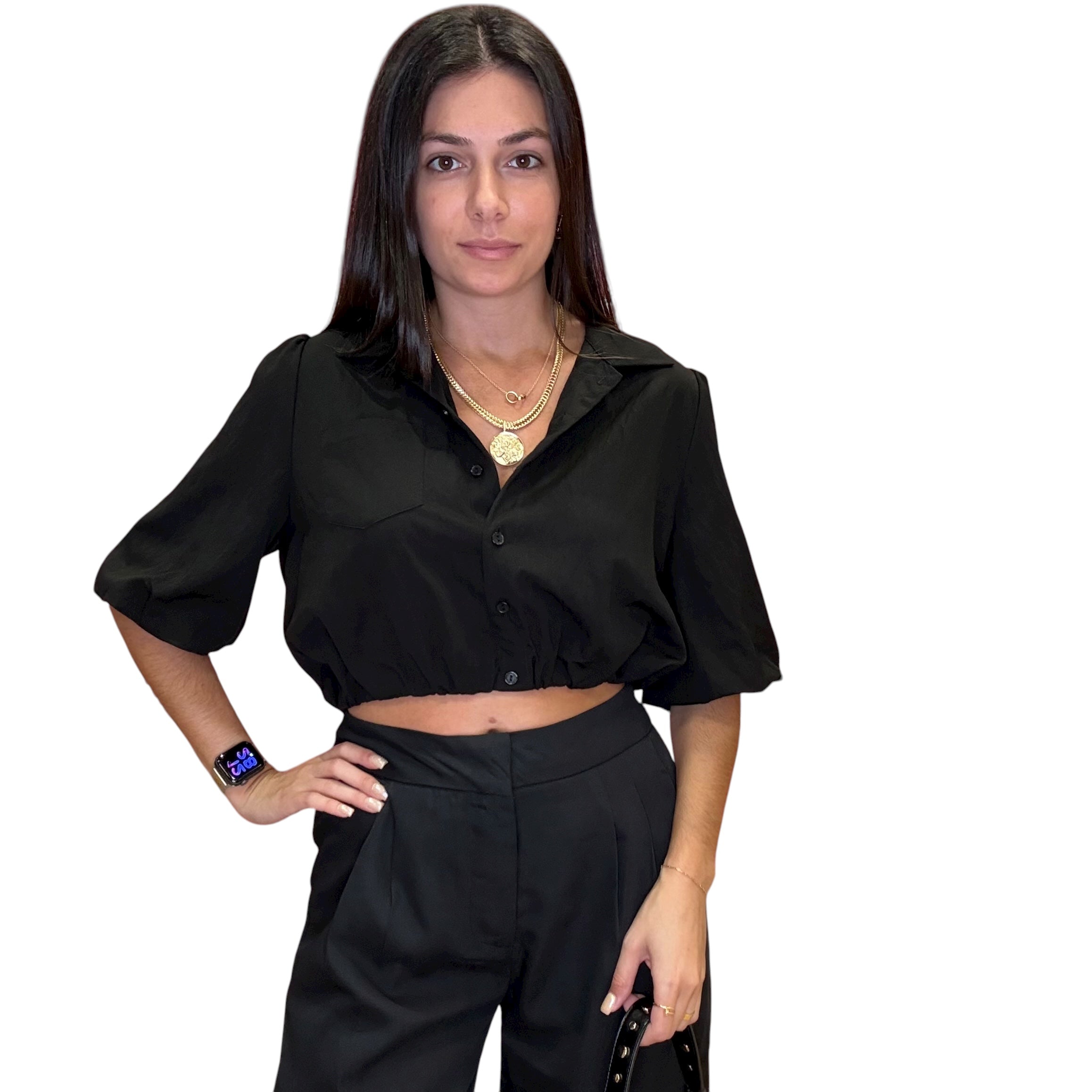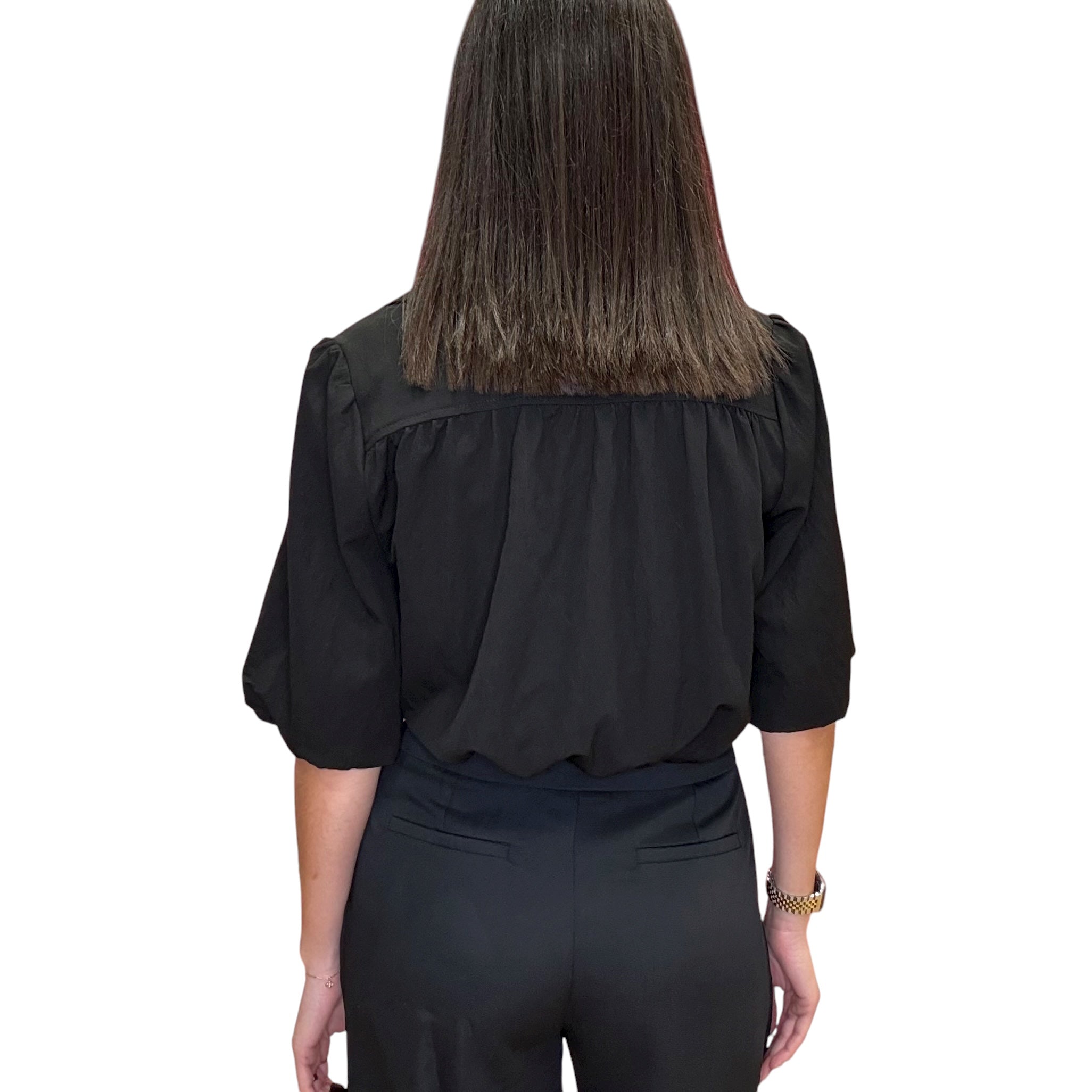 Effortless and chic, this cropped button-up blouse in black features a bubble hem and textured short sleeves. A closet staple with a playful twist.