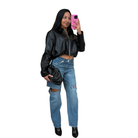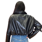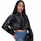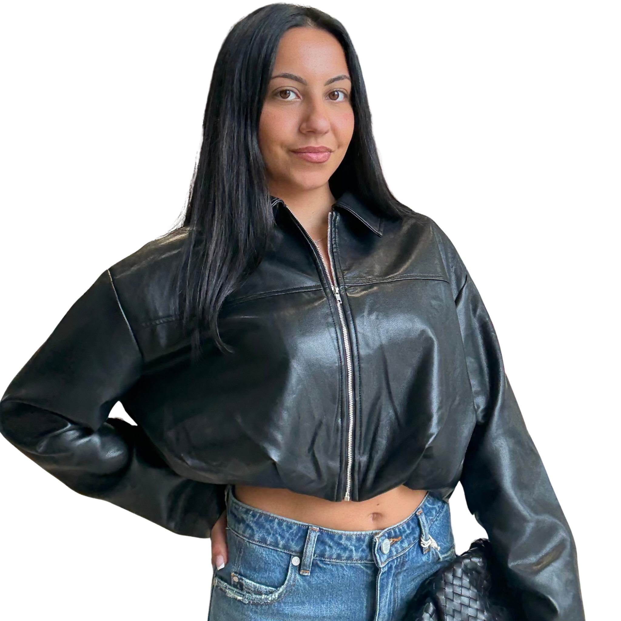 Bold + polished 👊 This cropped faux leather jacket brings structure with its pleated bubble hem and sharp collar, finished with an exposed zipper for a modern edge. A total statement piece.