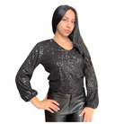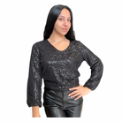 Made for the spotlight ✨ The Black Sequin Blouse shimmers with every move, designed in a sleek black stretch sequin fabric with a flattering V-neck and relaxed fit.