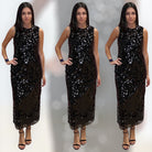 Turn heads in this show-stopping black midi dress, designed with shimmering sequin embellishments over a sheer mesh overlay. The sleek sleeveless cut and straight silhouette keep it chic, while the fully lined interior ensures a flawless fit. Finished with an invisible back zipper for that seamless look.