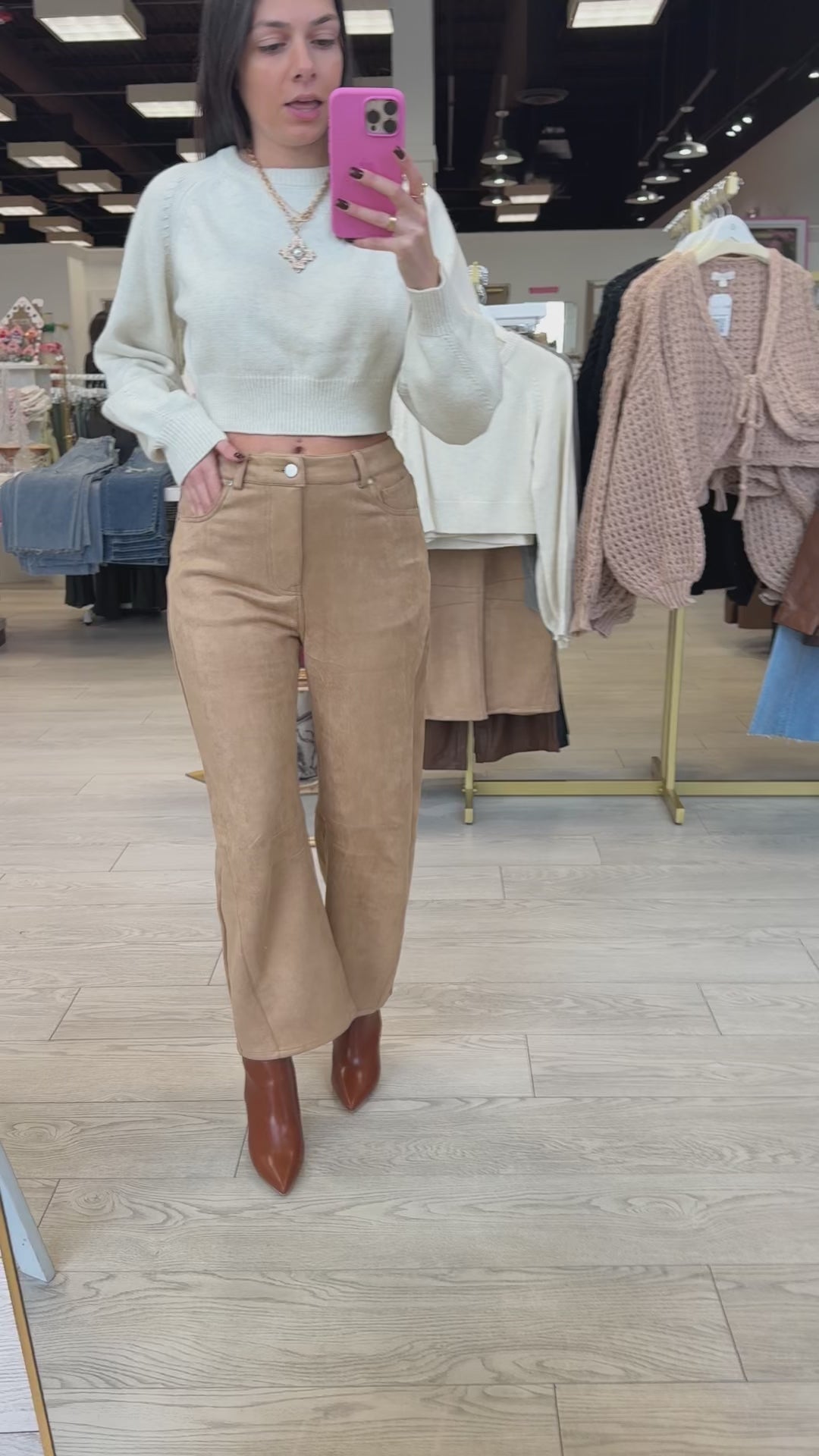 Soft faux suede meets a modern barrel-leg cut for pants that feel as good as they look. Taupe tone keeps them versatile for day-to-night styling.