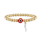 A bold twist on protection—our Evil Eye Bracelet features sleek polished beads, a fiery red glass evil eye, and a lucky horn charm. Worn for centuries as a symbol of strength, protection, and good fortune, this limited edition stacker brings a modern edge to an ancient tradition.