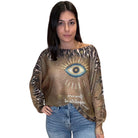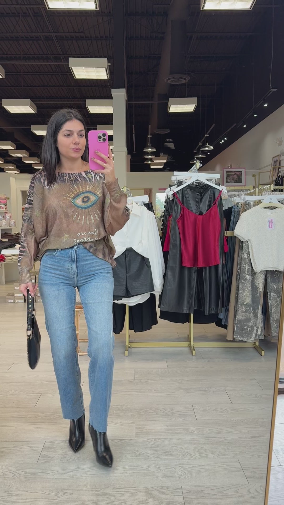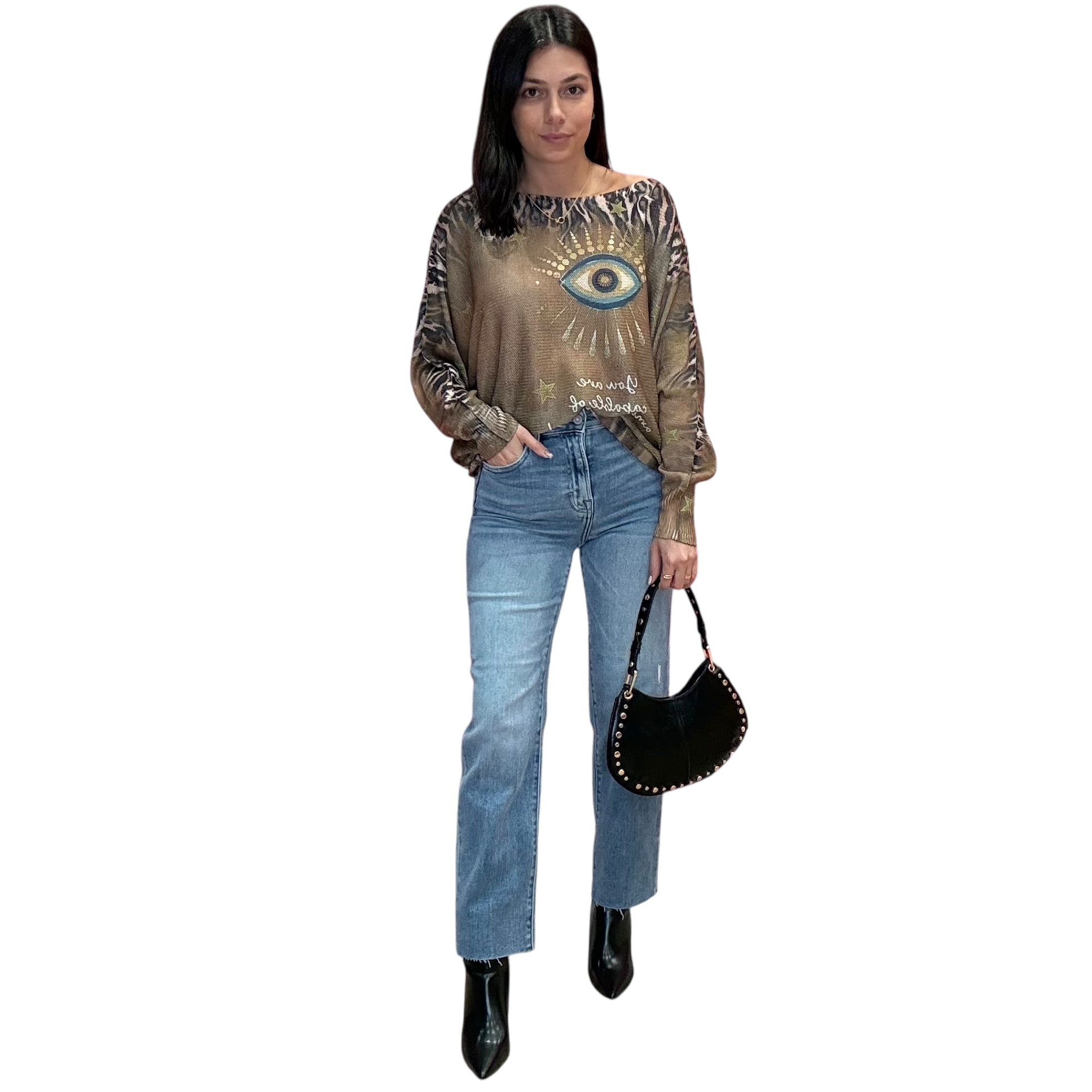 A statement piece that’s still totally cozy. This Italian brown knit sweater features a bold eye design that adds personality to your fall look. Soft, warm, and effortlessly cool — it’s comfort with a little attitude.