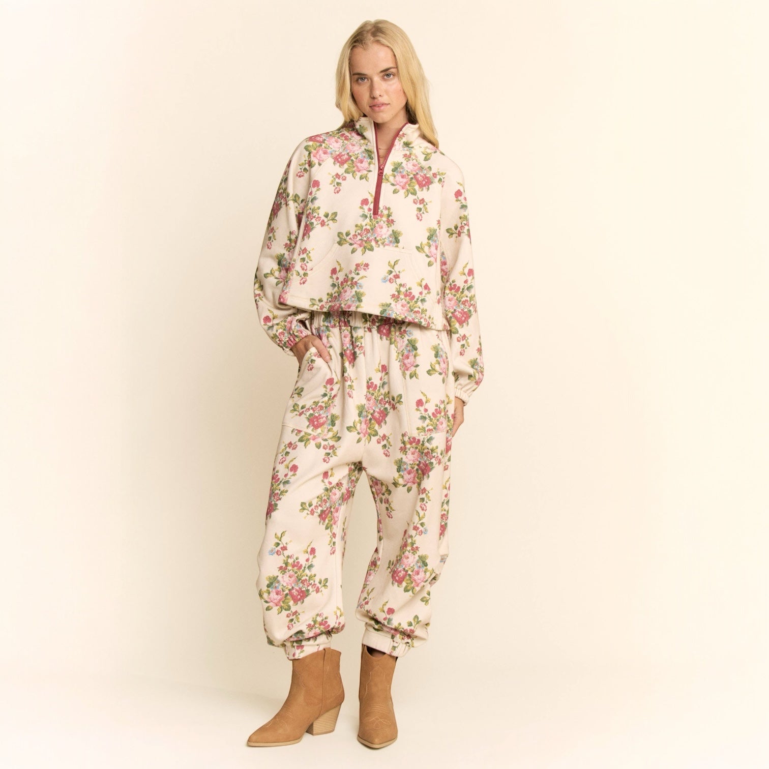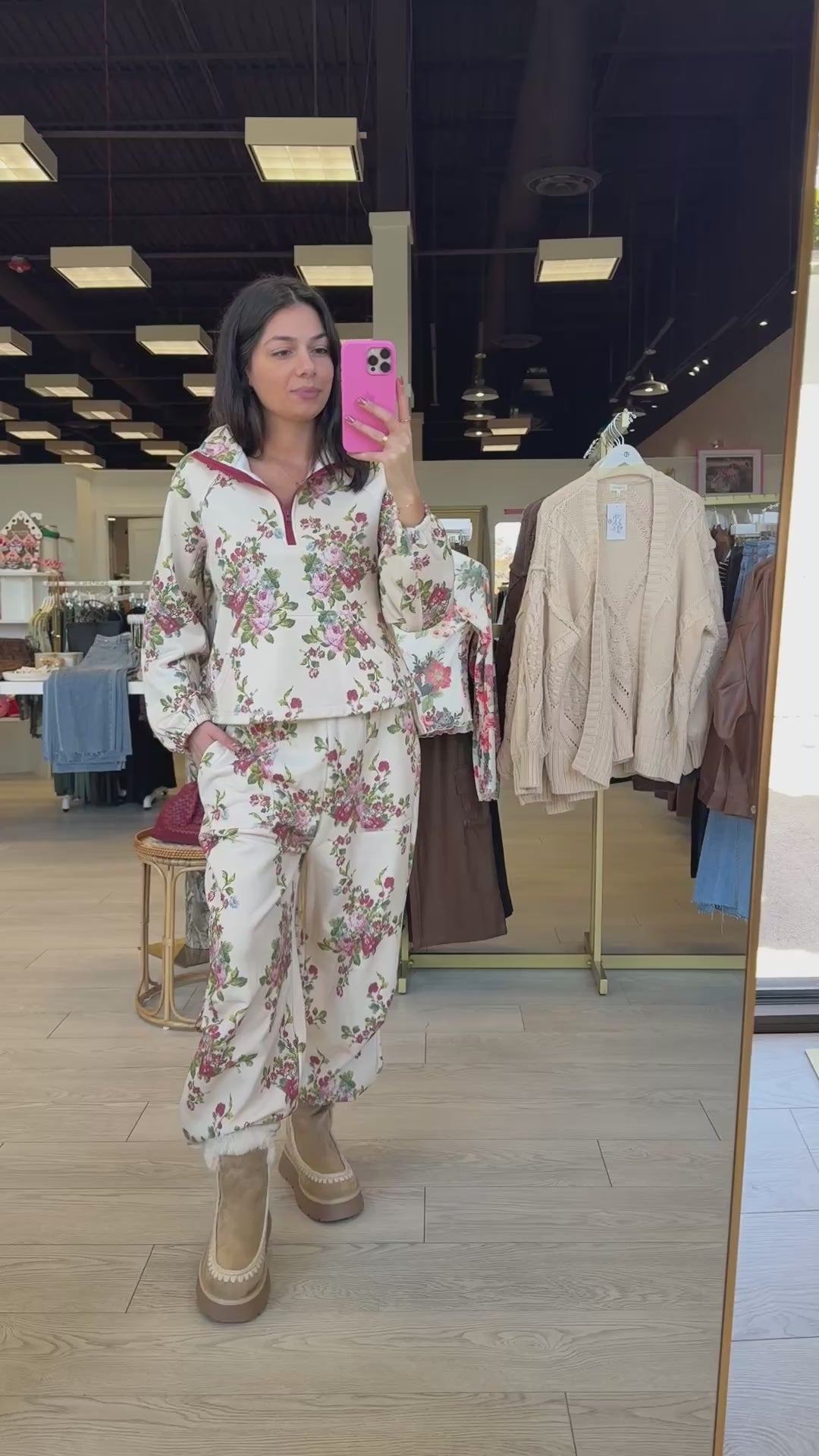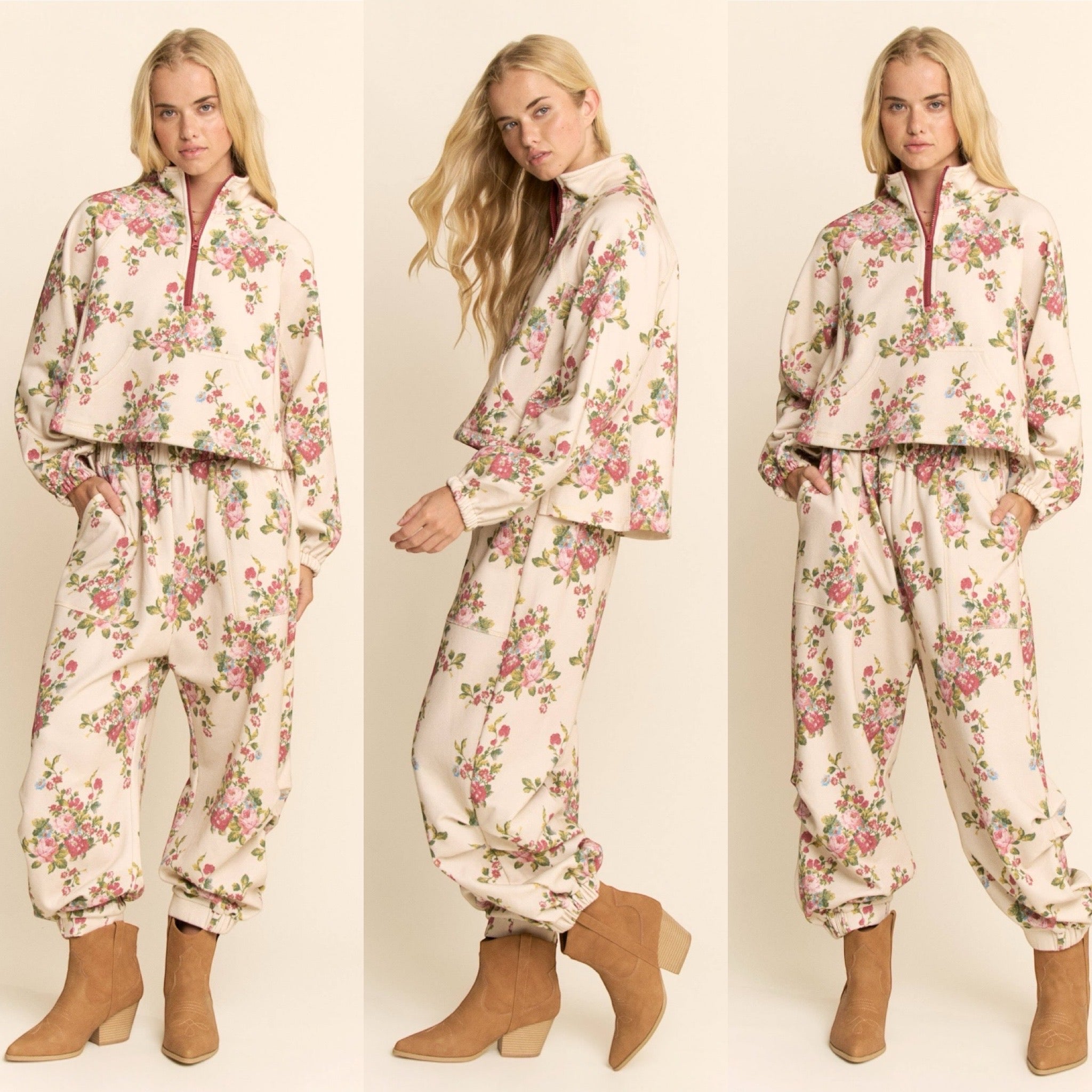 Romantic, comfy, and effortlessly chic — this floral jogger set is your new go-to for cozy days that still look put-together. Featuring a half-zip pullover top and elastic waist jogger pants, this set was made for lounge-to-lunch moments. The soft ivory base with a delicate rose bouquet print adds that feminine touch we love, while the elastic cuffs and relaxed fit keep it perfectly easy.