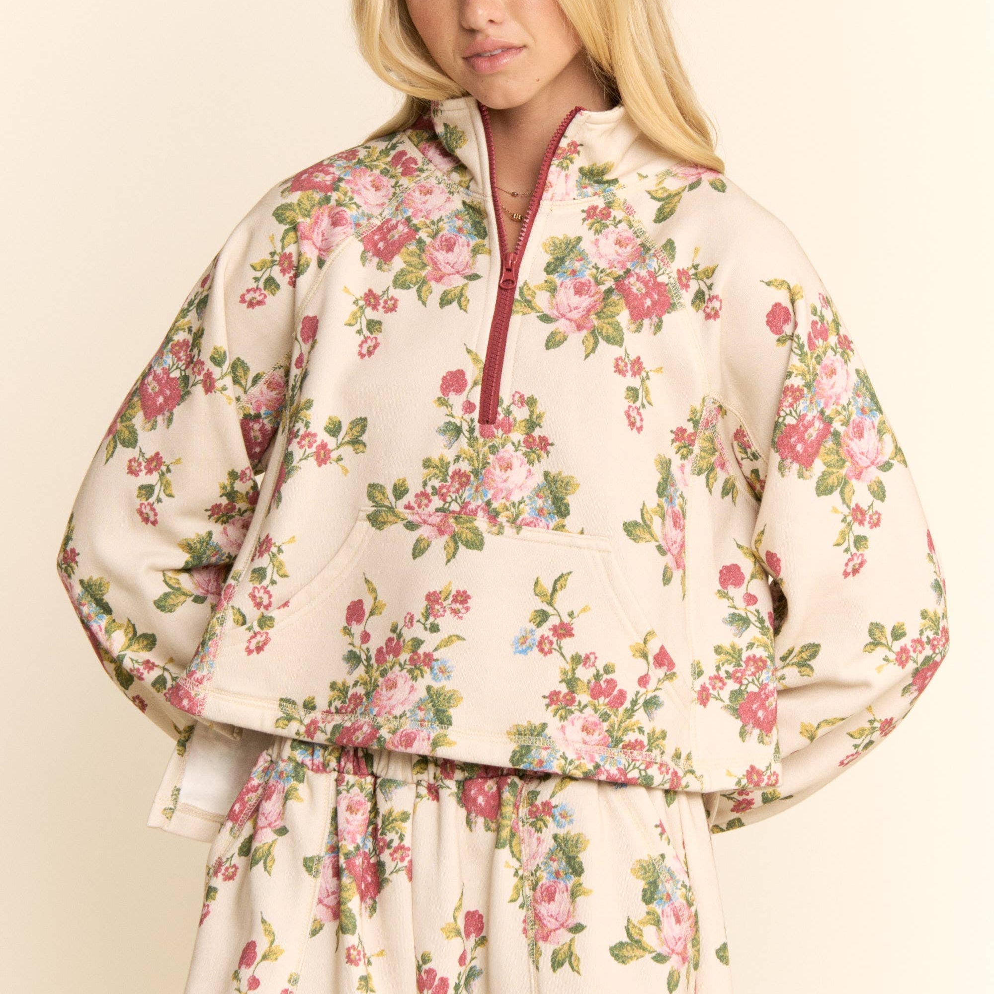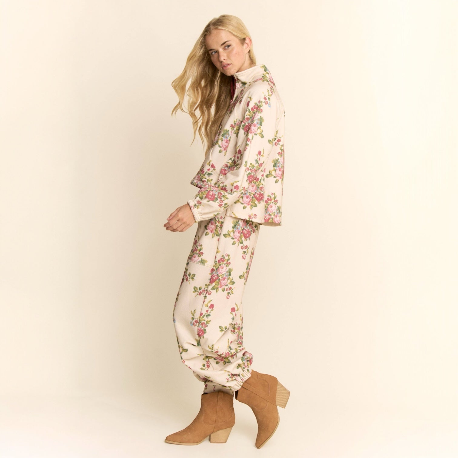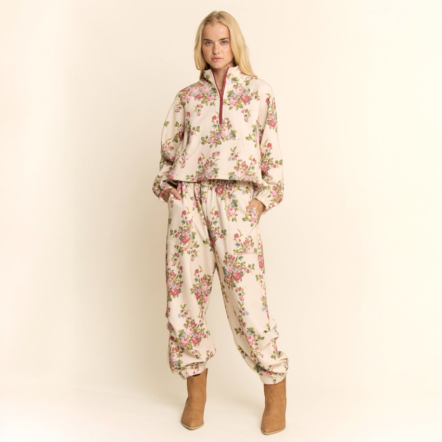 Romantic, comfy, and effortlessly chic — this floral jogger set is your new go-to for cozy days that still look put-together. Featuring a half-zip pullover top and elastic waist jogger pants, this set was made for lounge-to-lunch moments. The soft ivory base with a delicate rose bouquet print adds that feminine touch we love, while the elastic cuffs and relaxed fit keep it perfectly easy.