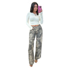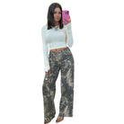 Make an edgy entrance with these wide-leg jeans featuring an all-over distressed splatter print. A stone and grey color palette meets street-style silhouette—these pants bring full attitude. Mid-rise, relaxed fit, and so on-trend.
