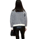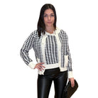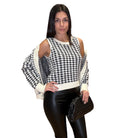 This two-piece sweater set features a cropped tank and matching button-down cardigan in classic ivory and black houndstooth. The perfect mix of cozy and cool, it's a holiday essential you’ll wear all season long.