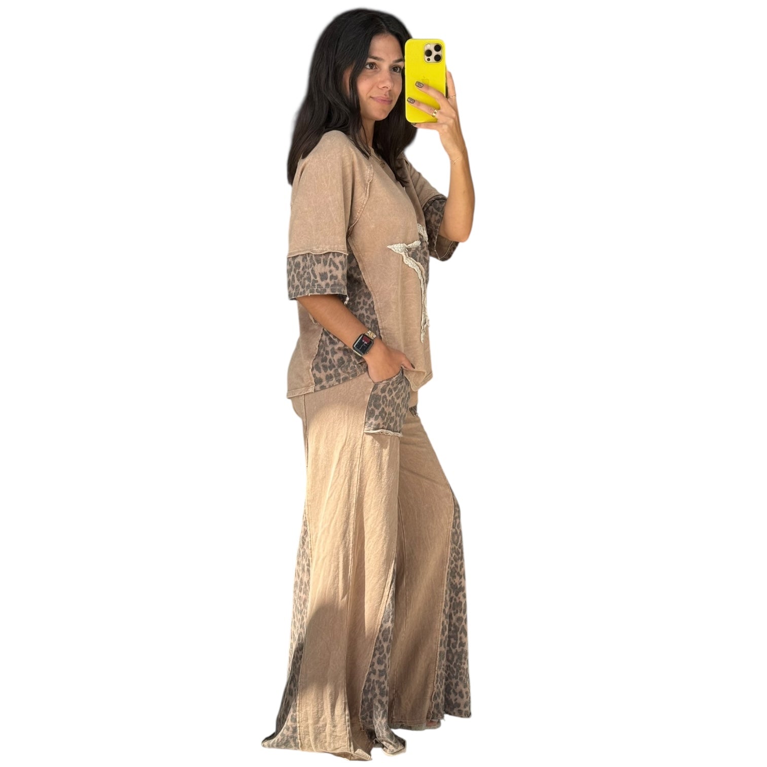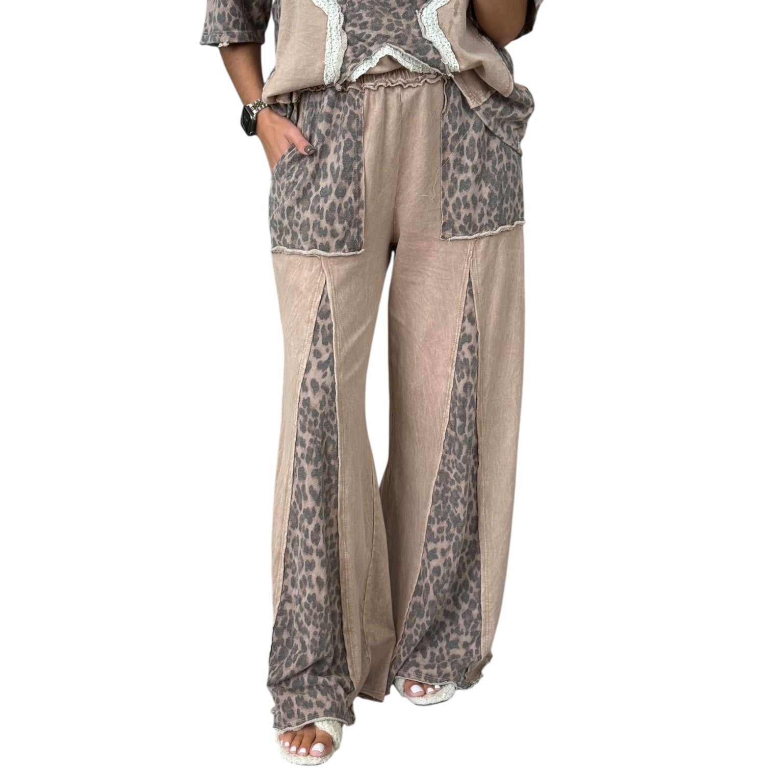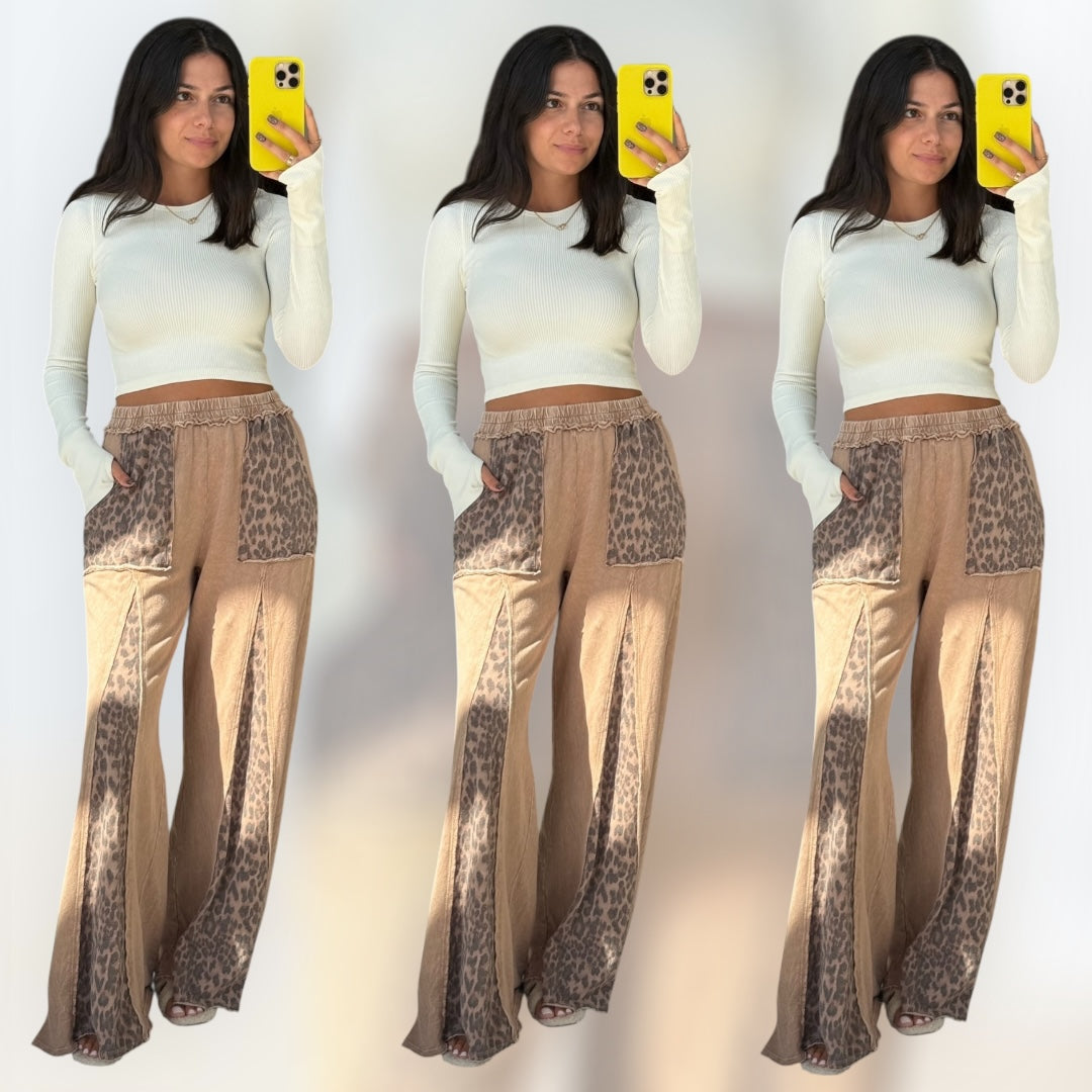 These latte-toned leopard print pants feature a wide flare leg, comfy waistband, and washed finish that gives them a chill, vintage vibe.