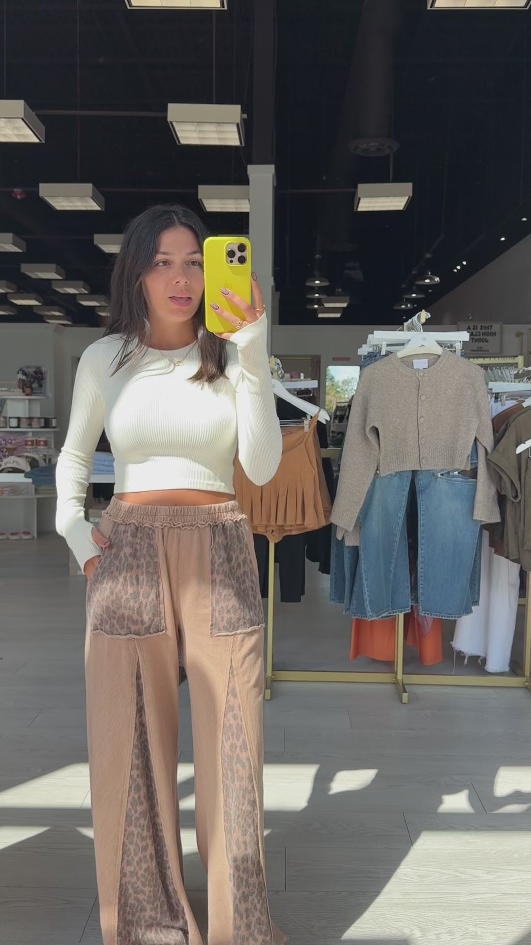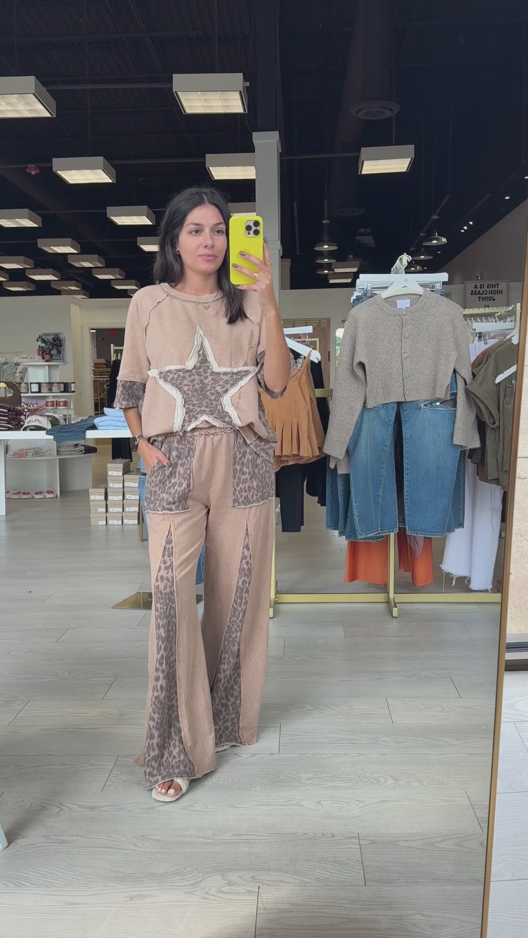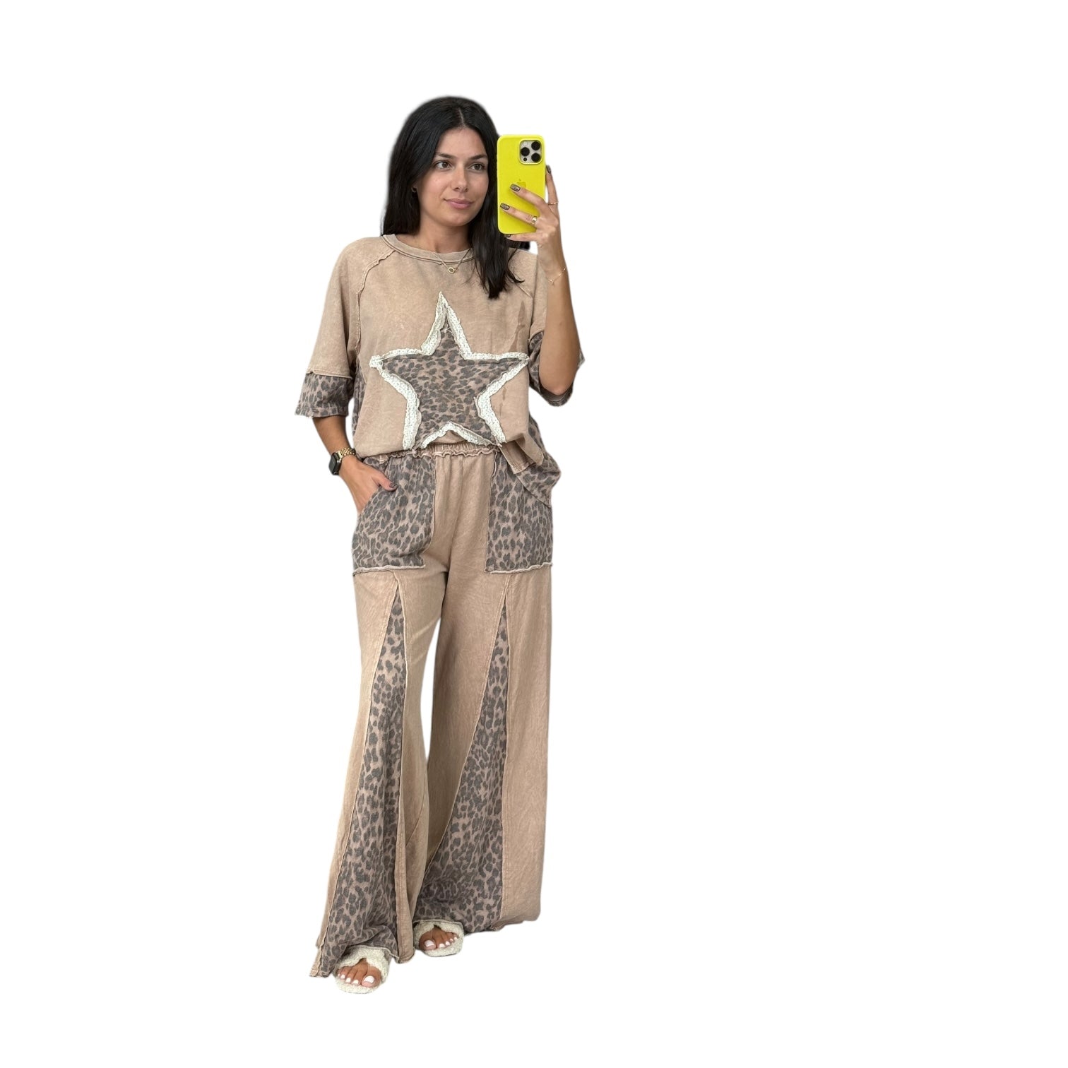These latte-toned leopard print pants feature a wide flare leg, comfy waistband, and washed finish that gives them a chill, vintage vibe.
