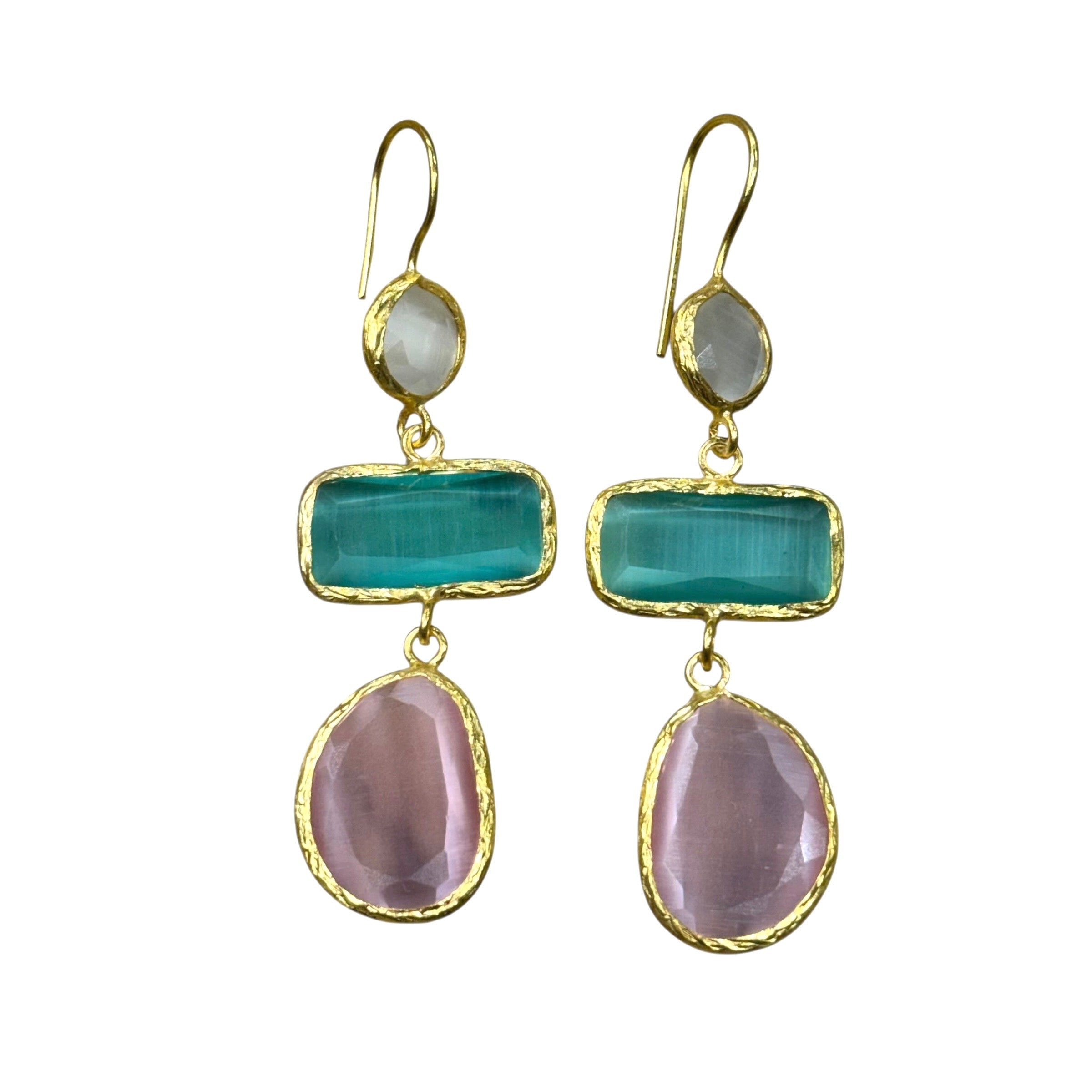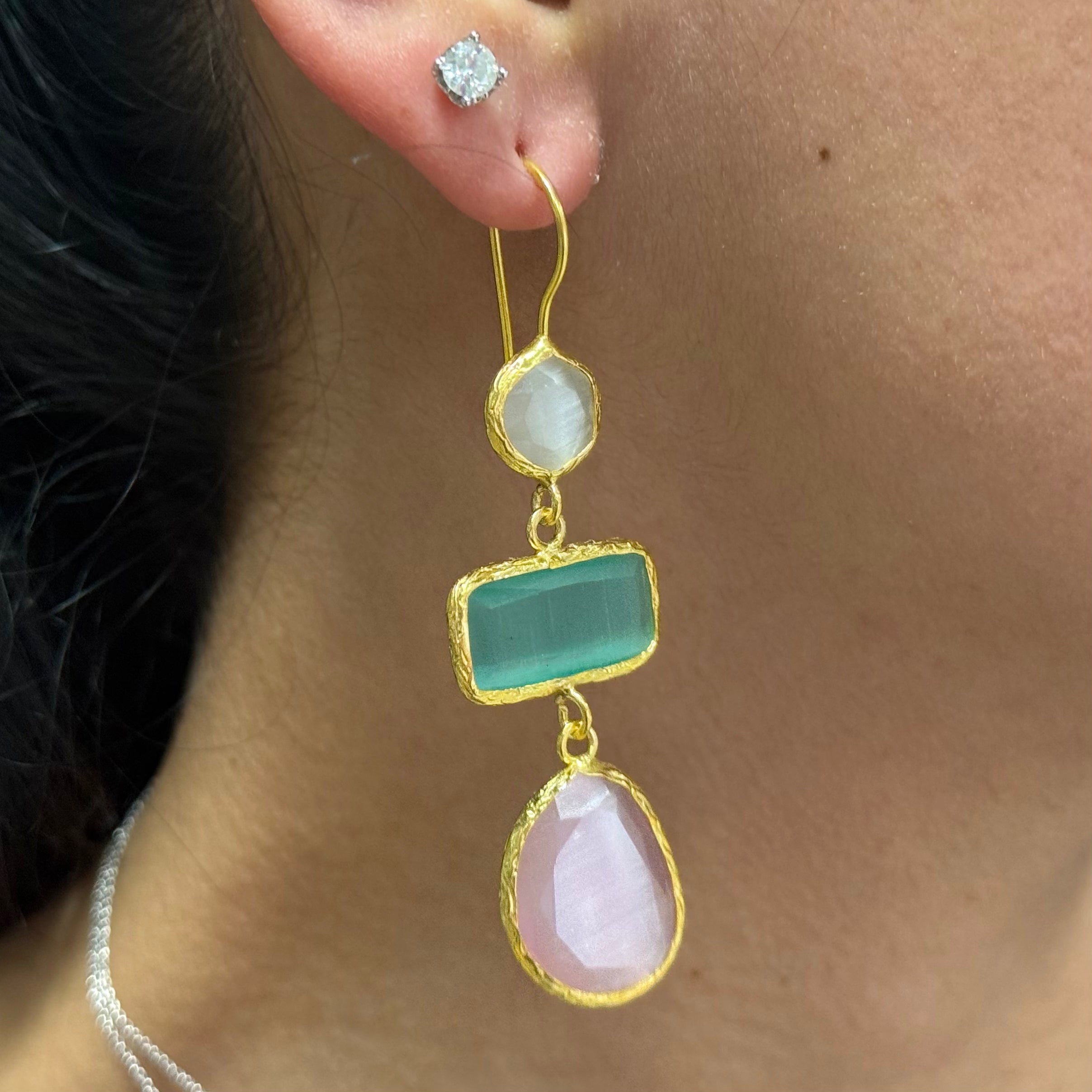 18K gold-plated brass earrings featuring three cascading drops with a subtle cat-stone shimmer. Colorful, artsy, and lightweight with great movement. 🌈✨