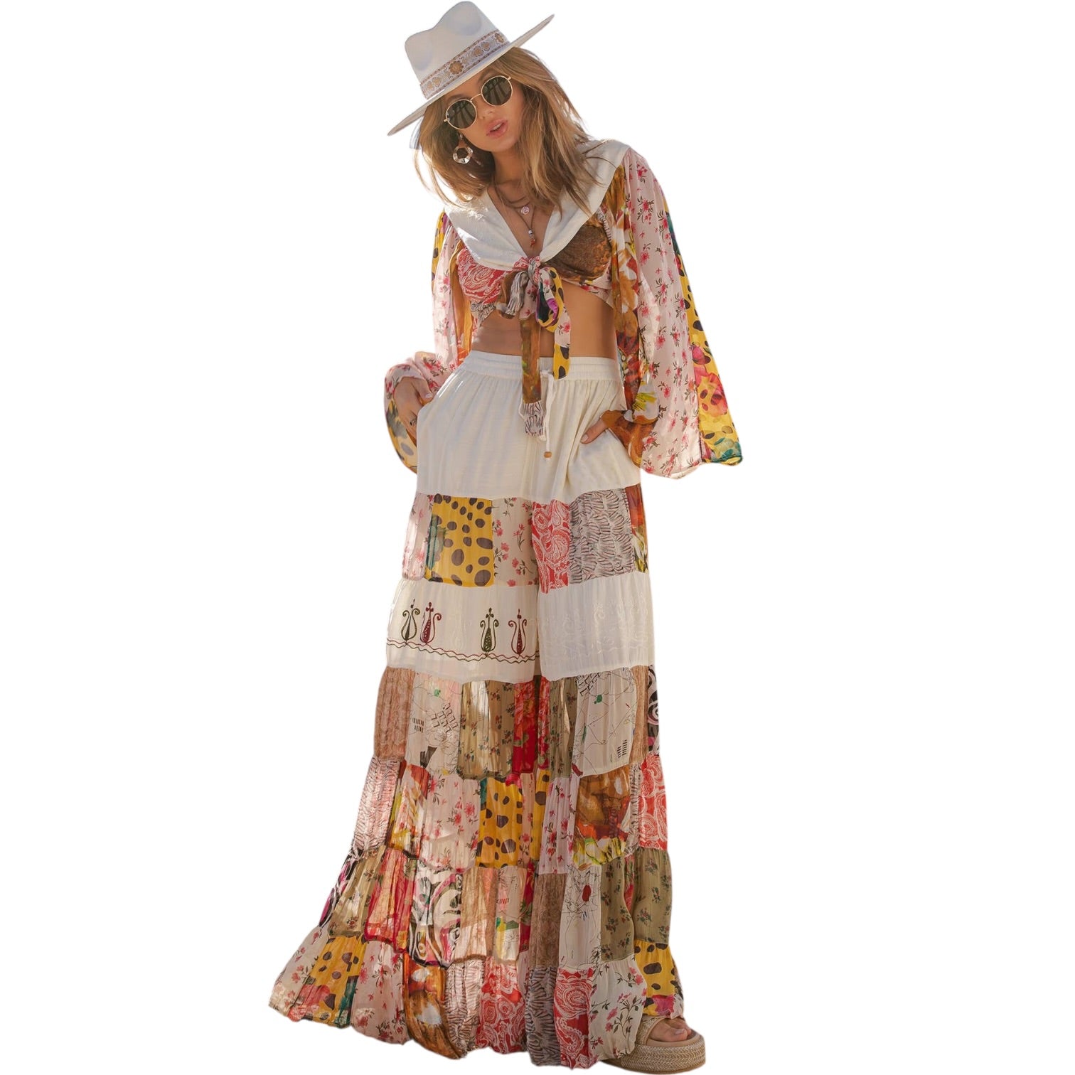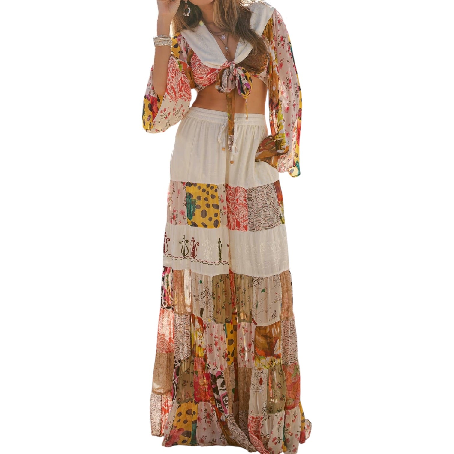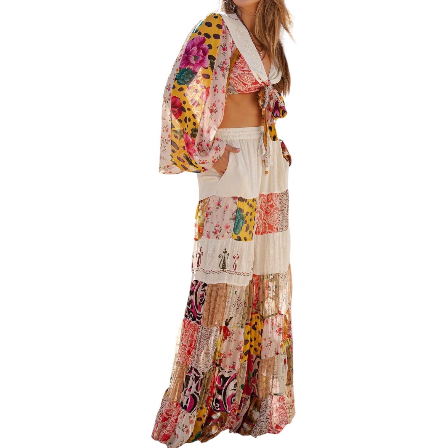 ✨ A true statement set made for sunshine days and golden hour plans. This artisan-inspired patchwork co-ord features a tie-front cropped top paired with flowy, tiered wide-leg pants for that effortless boho feel. Crafted from a lightweight rayon blend, it’s soft, breathable, and moves beautifully with every step. The elastic waist keeps things comfy while the mixed patchwork print gives it that one-of-a-kind, festival-ready vibe 🌞🌿