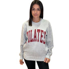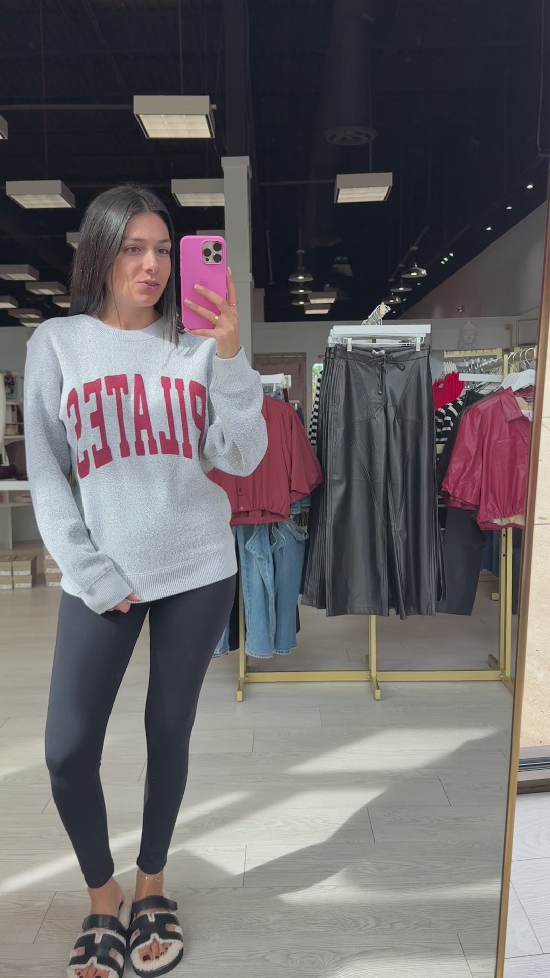 Cozy meets cool with our silver-gray Pilates Knit Sweatshirt. Designed with a bold crimson puff “Pilates” front detail and a subtle gameday vibe, this knit sweatshirt brings sporty-chic energy into your everyday style. Perfect for layering to and from class or lounging with a latte in hand.