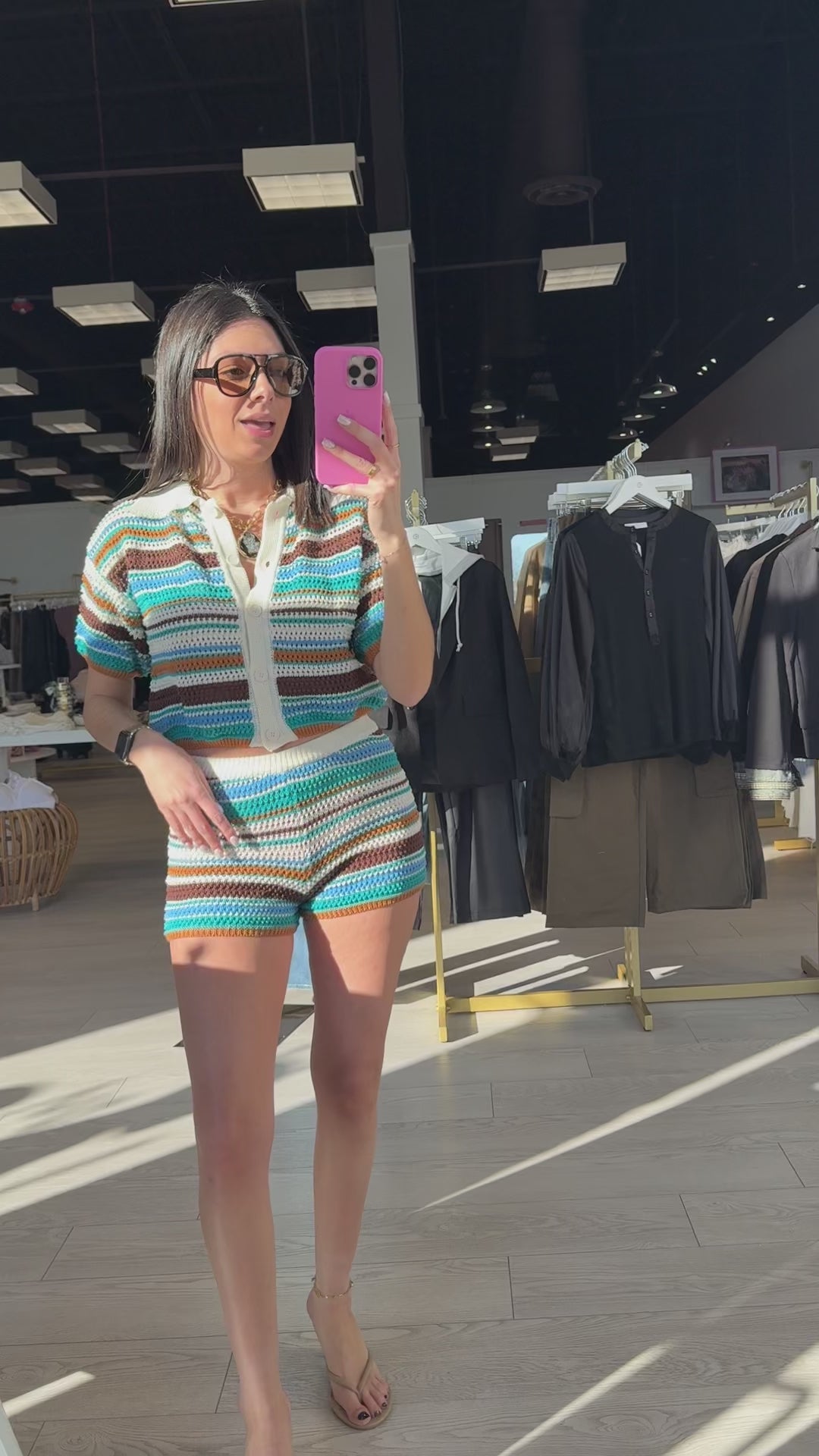 A colorful crochet moment with major retro energy 🌈 This striped two-piece features a collared short-sleeve button-up top paired with high-waisted shorts for an easy, throw-on-and-go look that still feels styled. Lightweight, breathable, and made for sunny days and salty air ☀️