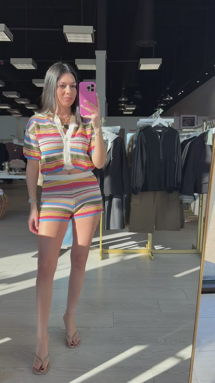 A colorful crochet moment with major retro energy 🌈 This striped two-piece features a collared short-sleeve button-up top paired with high-waisted shorts for an easy, throw-on-and-go look that still feels styled. Lightweight, breathable, and made for sunny days and salty air ☀️