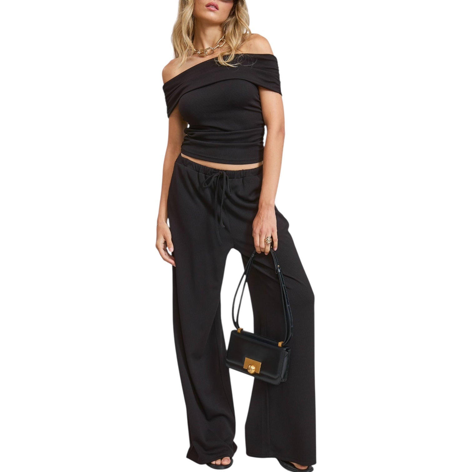 This off-the-shoulder matching set is the definition of casual chic. The textured, ruched top gives just the right amount of shape while the relaxed, full-length drawstring pants keep things comfy and cool. Easy to wear, easy to style—this is your go-to set for lounging, brunching, or running around feeling put together with zero effort. 🖤✨