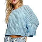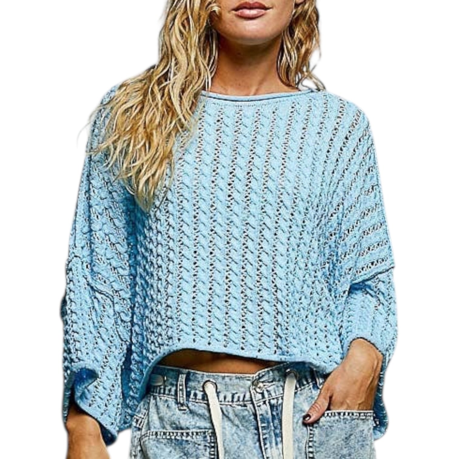 Soft shine, easy fit ✨ This cropped knit top features a round neckline, 3/4 sleeves, and a subtle shimmer that makes it feel special while still wearable.