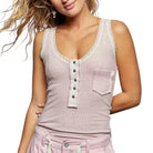 The kind of top you reach for on repeat. This sleeveless ribbed knit tank features a flattering V-neckline with delicate lace trim, a functional button front, and a subtle mini pocket detail that keeps it feeling special. Fitted but comfortable, it’s easy to wear solo or layered all year long 🤍✨