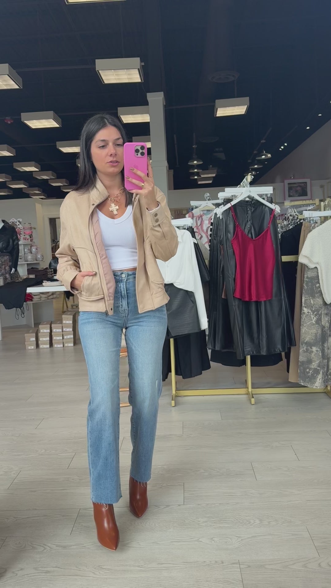 Luxe suede vibes meet oversized street chic in our Verona Suede Pocket Jacket. Designed with curved pocket details, a cozy high neckline, and a relaxed fit, this jacket is the perfect mix of soft glam and everyday cool. A fall-to-winter layer you’ll live in.