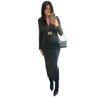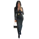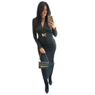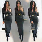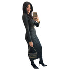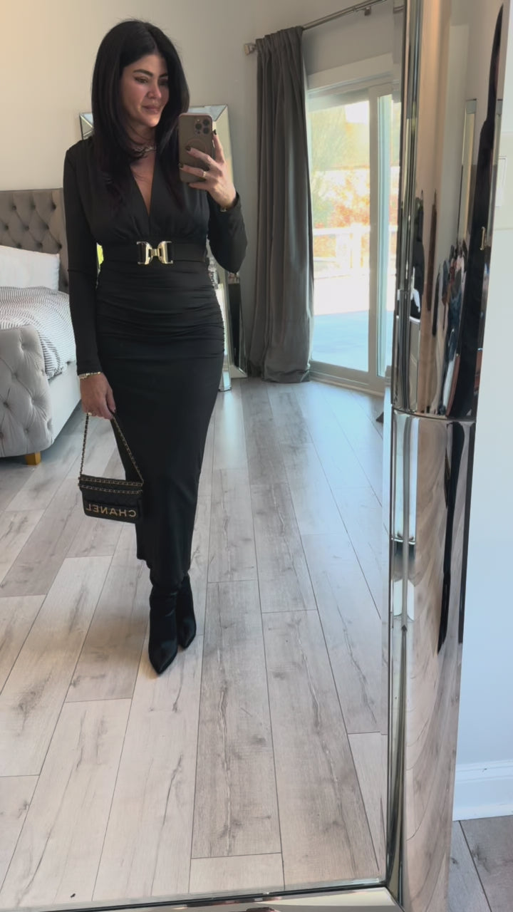 A forever favorite. The Icon Midi Dress in jet black hugs every curve with sleek sophistication. Long sleeves, a deep neckline, and smooth stretch fabric create a silhouette that’s equal parts classic and powerful. Belt included. Pair it with your favorite statement boots for that effortless luxe look.