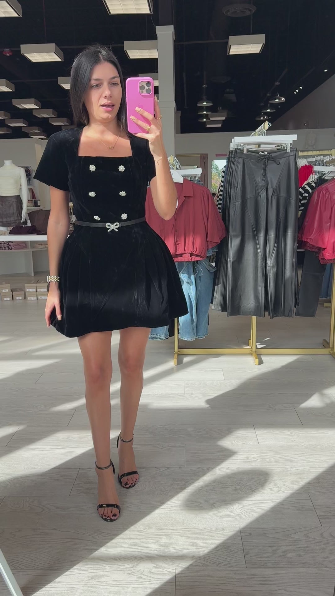 Classic meets sultry in this luxe velvet mini dress. Featuring a structured square neckline, jeweled button accents, and a chic removable bow-buckle belt, it’s the little black dress you’ll keep reaching for. The pleated skirt adds movement, while the fully lined design with an invisible back zipper keeps it effortlessly polished.