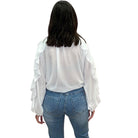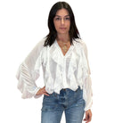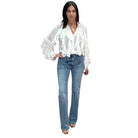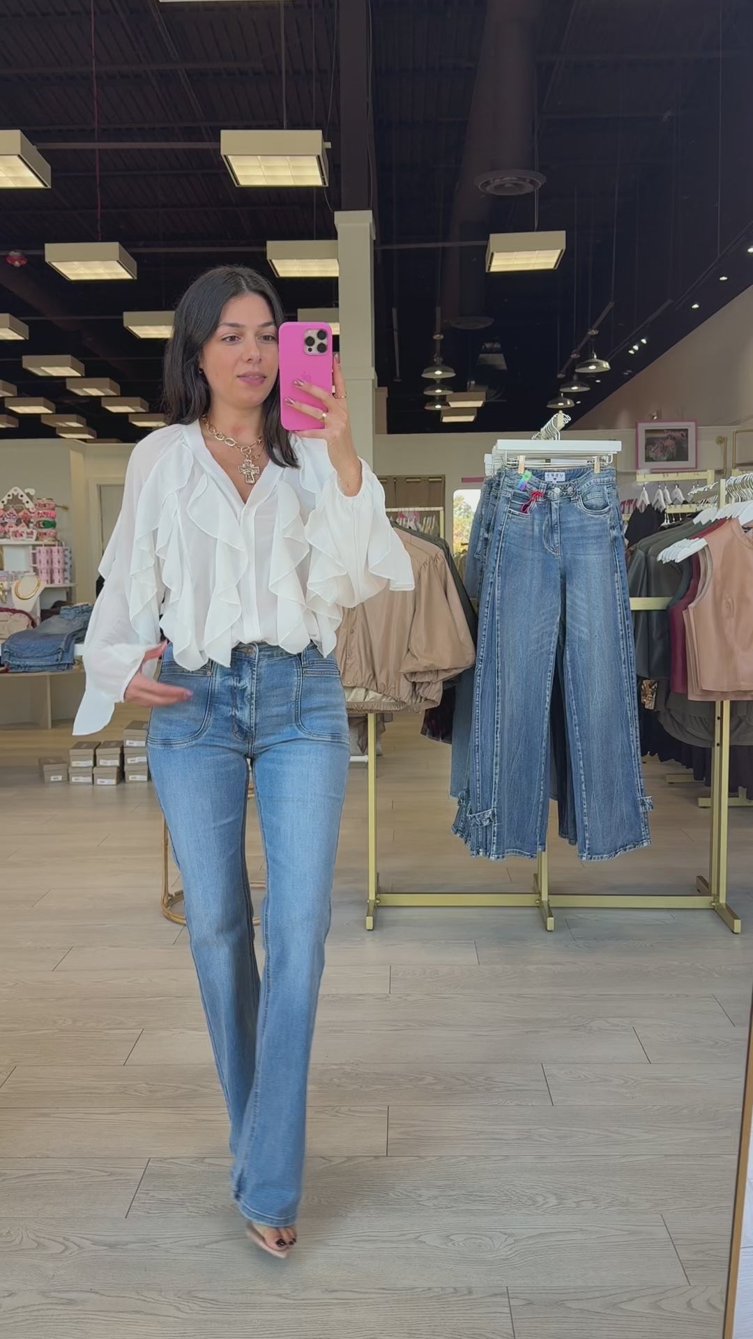 Graceful and timeless 🤍 The La Bella Ruffle Blouse floats with every move, featuring cascading ruffles down the front and sleeves for soft, feminine movement. Its airy chiffon drape and flattering V-neckline make it the ultimate holiday dinner or girls-night top.