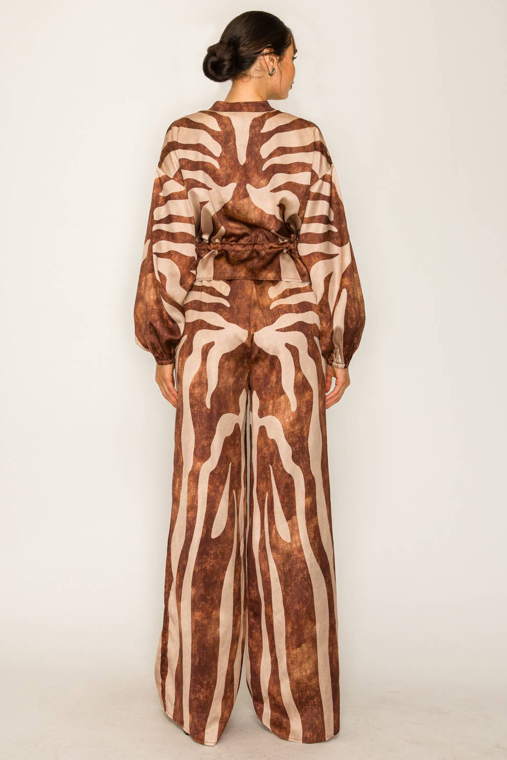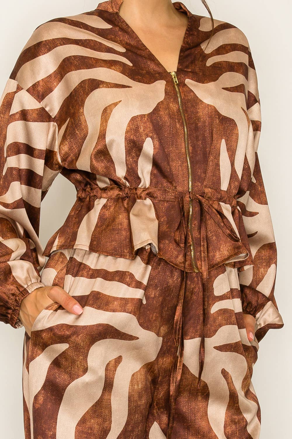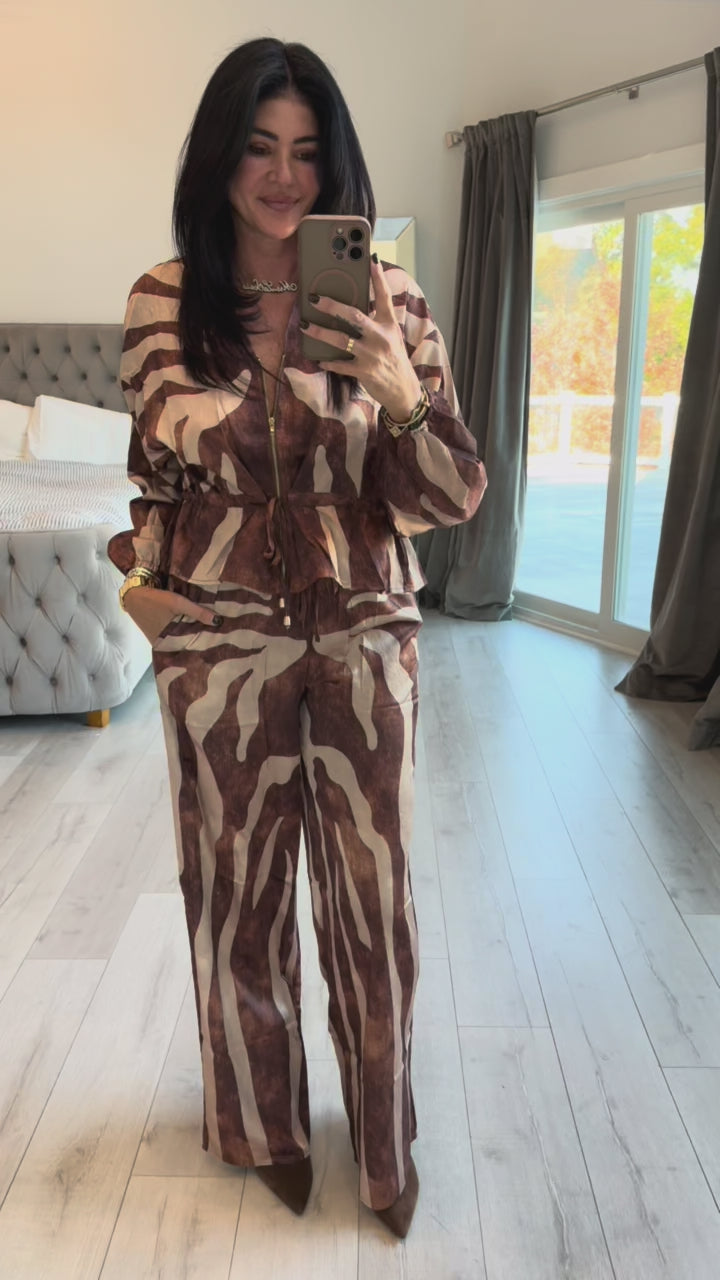 Turn heads in this bold zebra print satin set — a luxe, lightweight two-piece that can be worn together as a statement jumpsuit or styled separately for endless looks. The silky top features a zip front and drawstring waist, paired with flowy wide-leg pants that move beautifully with you. Chic, effortless, and totally versatile.