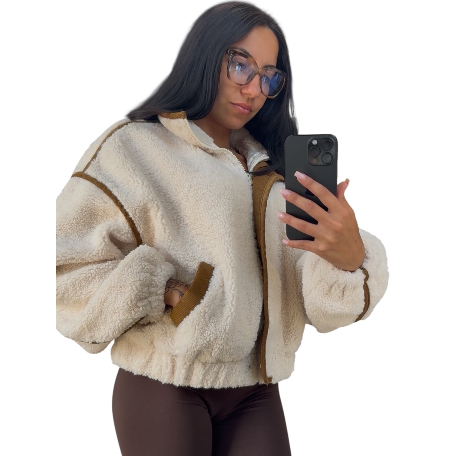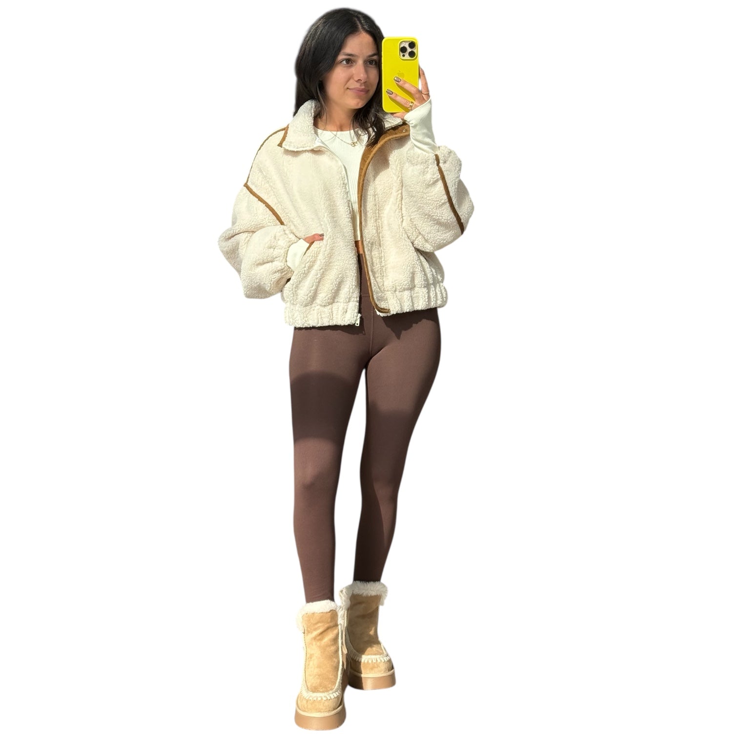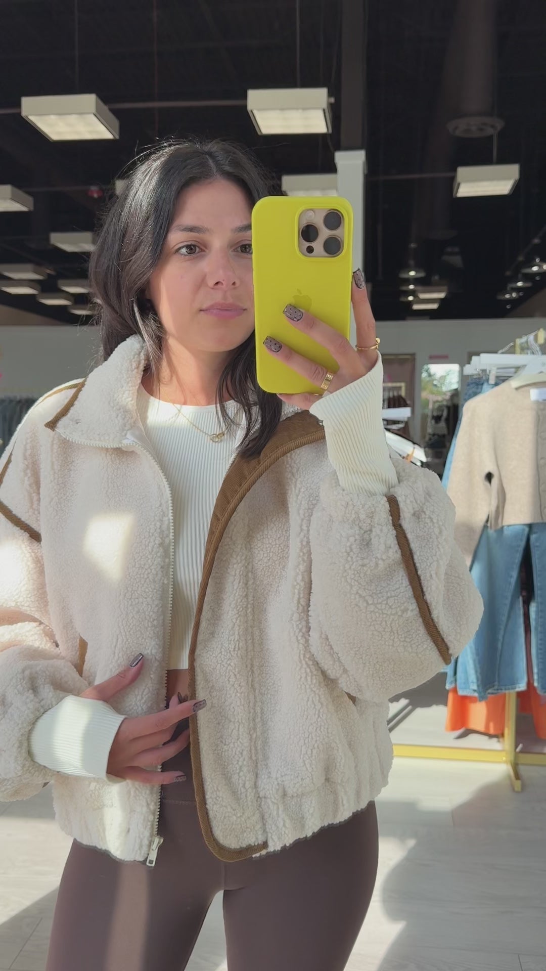 Alicia’s Styling Tip: Pair this sherpa jacket with chocolate brown leggings and chunky sneakers for an easy off-duty vibe, or throw it over a slip dress and boots for a cozy-chic contrast.