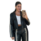 This jacket was made for making moves. Crafted from premium vegan leather, the cropped bomber features bold racing stripes — giving sporty-chic a whole new meaning.