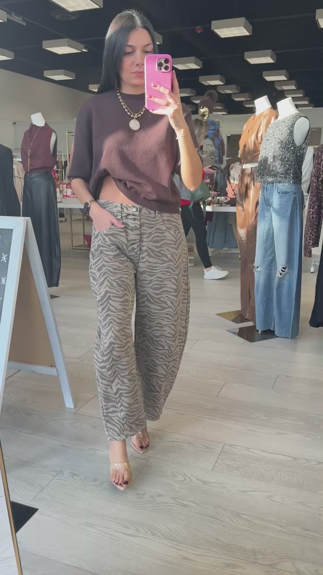 Unleash your wild side in these mocha zebra-print barrel jeans. Designed with a relaxed curved fit that tapers slightly at the hem, they strike the perfect balance between edgy statement and laid-back comfort.