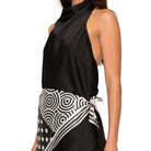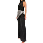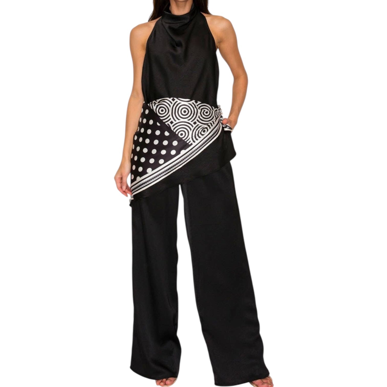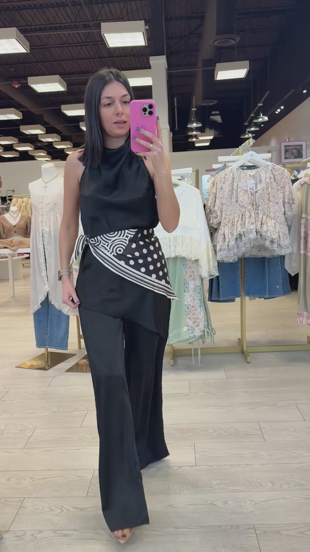 Minimal, modern, and so flattering. This sleeveless halter top and wide-leg pant set features a high neckline with soft drape detailing, an open back with button closure, and a flowy high-waisted pant that moves beautifully. Finished with a matching scarf for an extra styled touch, this set is perfect for dinners, events, or warm-weather nights out. Clean lines with just enough drama.