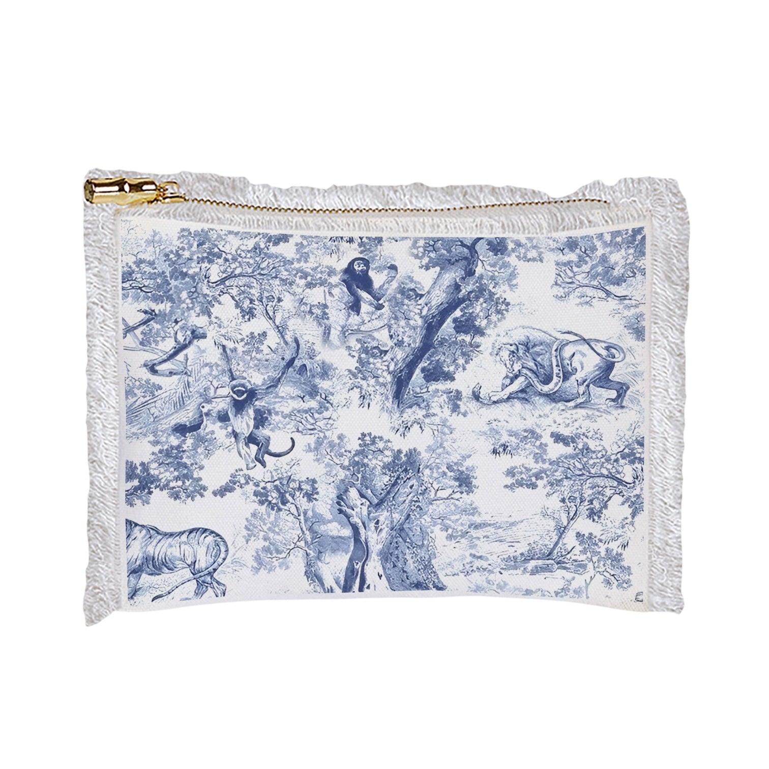 Vacay mode activated 🌴 This white linen cosmetic bag with bold blue jungle print and fringe trim is giving chic travel energy. Finished with a gold zipper and pull, it’s compact yet roomy enough for your beauty essentials. Large size measures 10.5" x 9" — perfect for tossing into your weekender or everyday tote.
