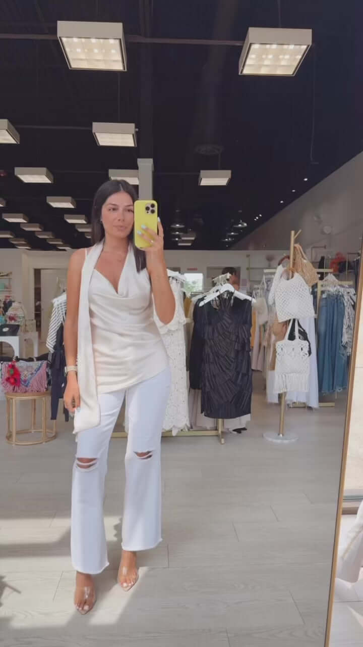 A flirty champagne satin scarf neck top designed to turn heads. With its silky finish and tie-back detail, it’s a glam upgrade to any night-out look.