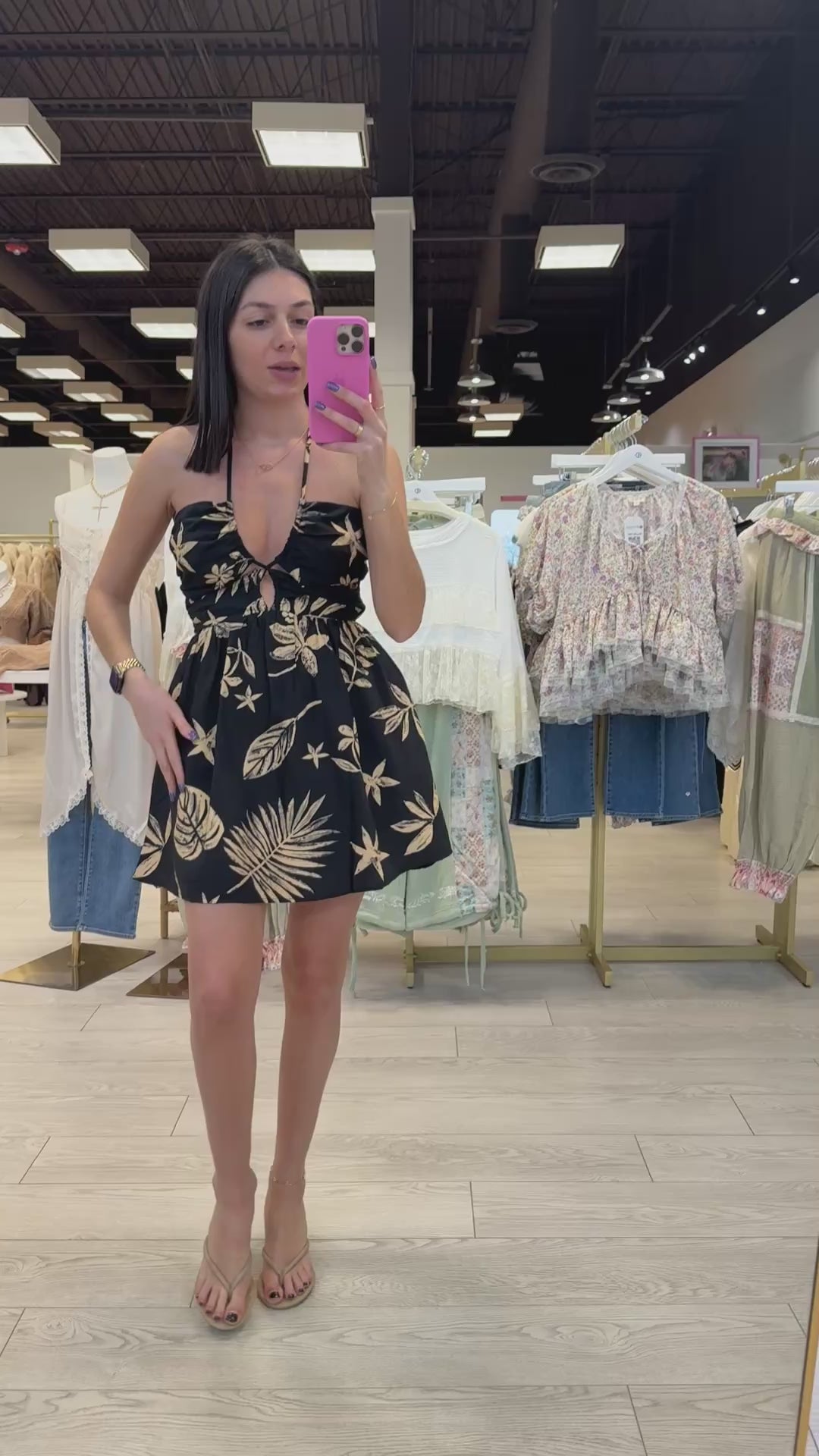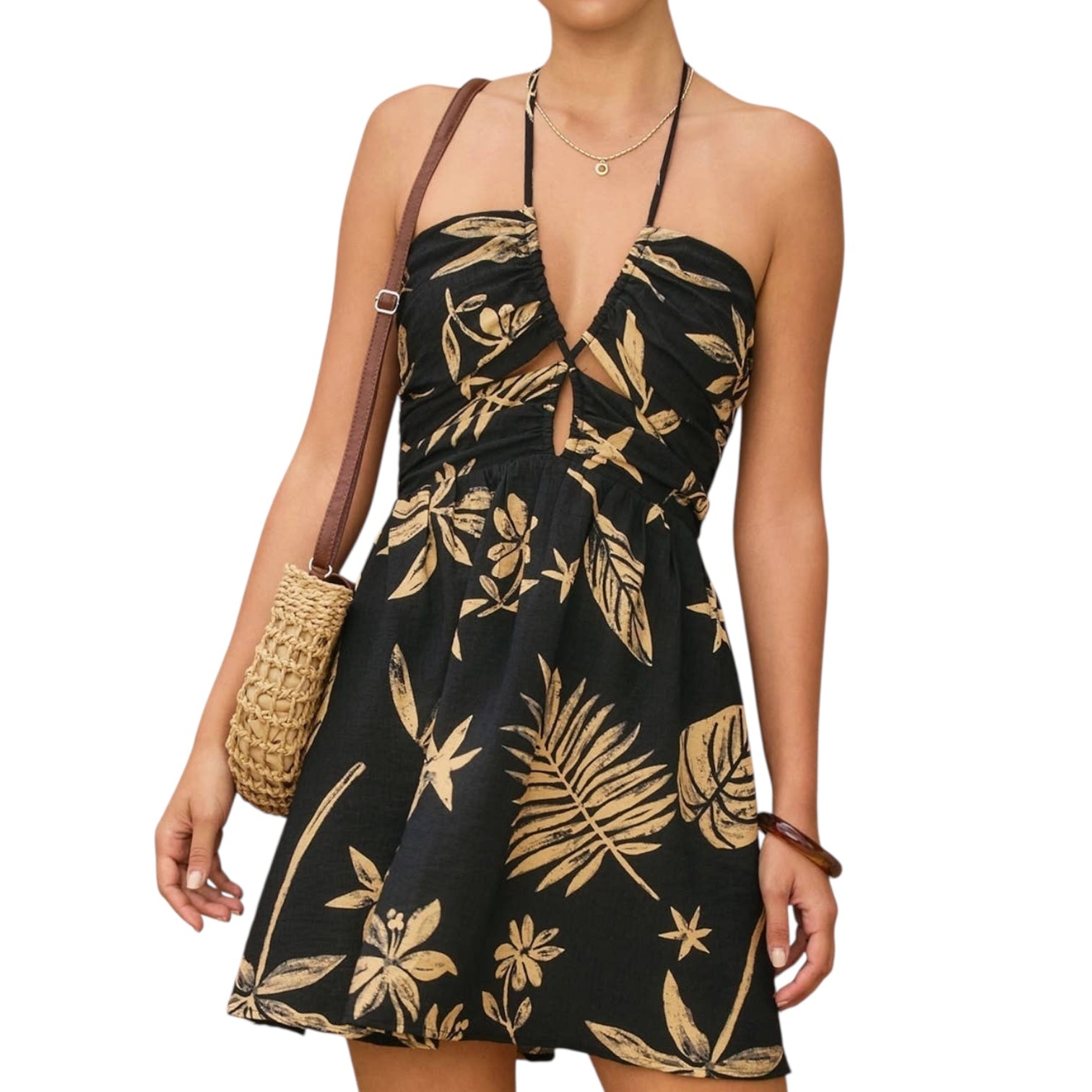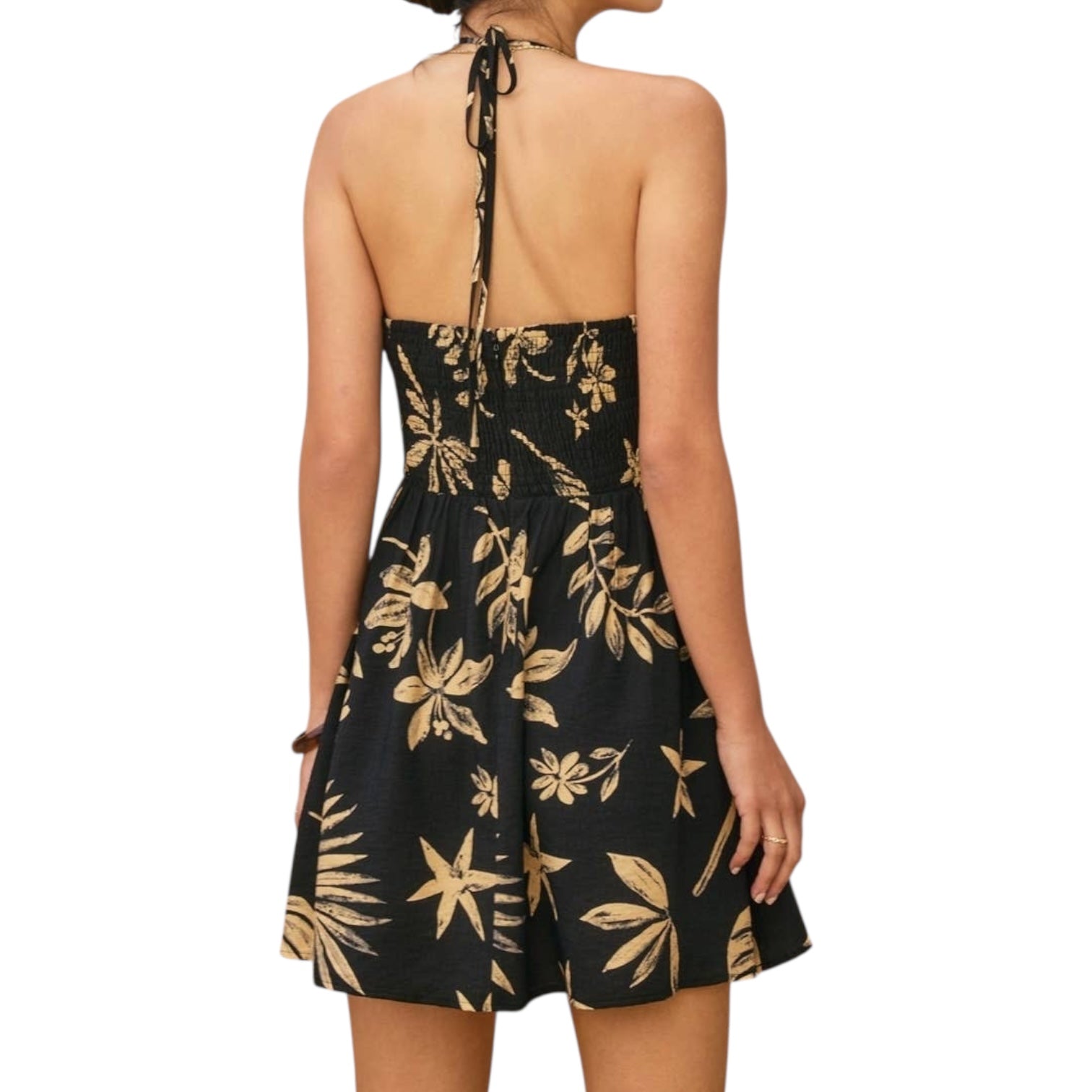 This ruched halter mini dress is made for sunshine moments 🌞 Featuring a tropical-inspired print with ruching through the bodice, it hugs in all the right places while staying light and comfy. The halter neckline adds a flirty finish, perfect for vacations, beach dinners, or summer parties ✨