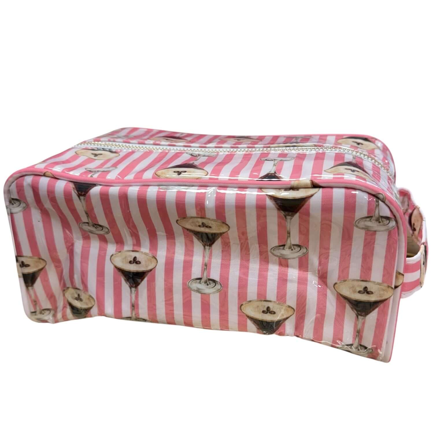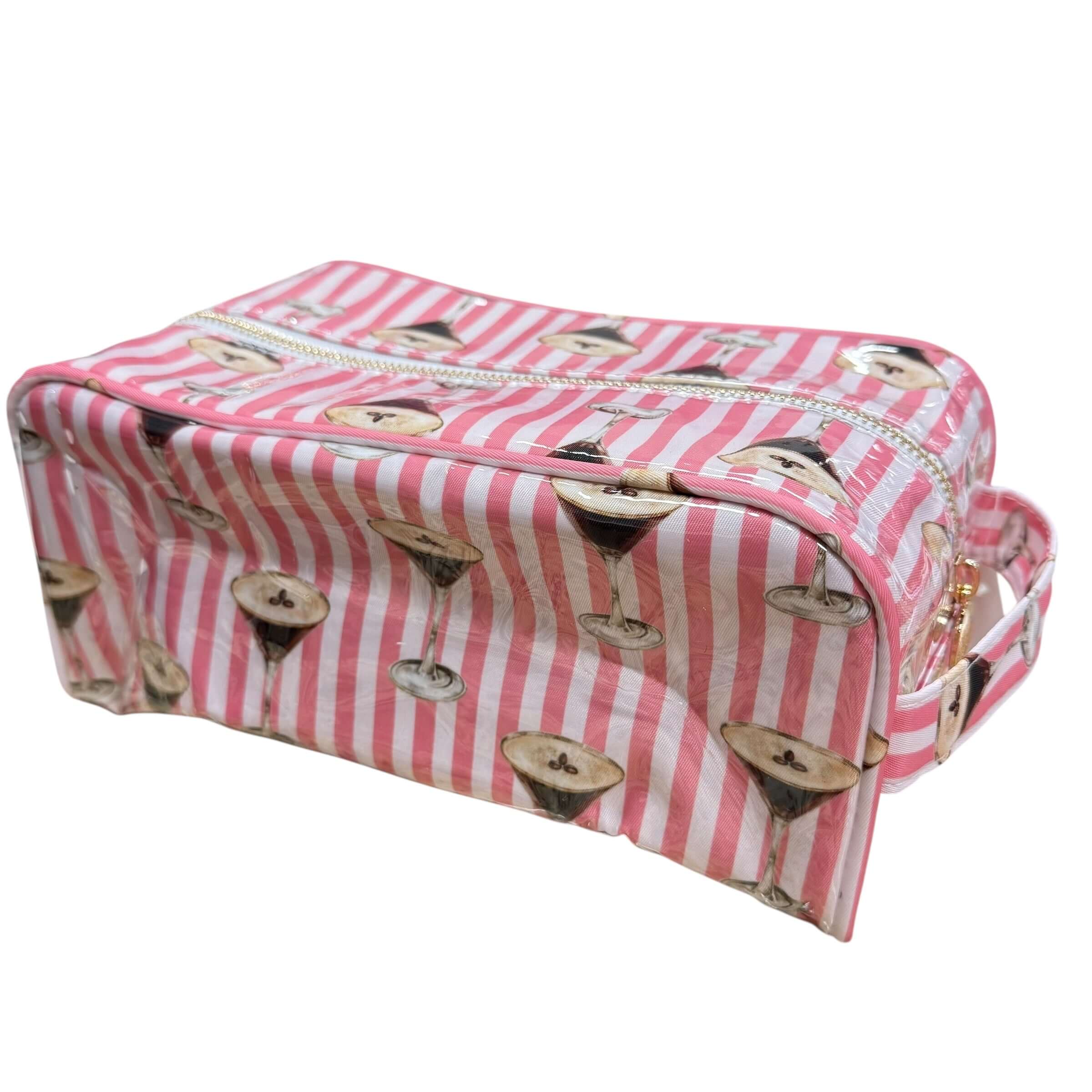 For the girl who packs beauty and a buzz — the Espresso Martini Glam Zip Bag is here to keep your essentials in check with a side of sass. Featuring playful pink stripes and the cutest cocktail print, this glossy, wipe-clean bag is roomy enough for skincare, glam tools, or travel must-haves. Gold zip closure, fully lined, and built for the beauty lover on the go.