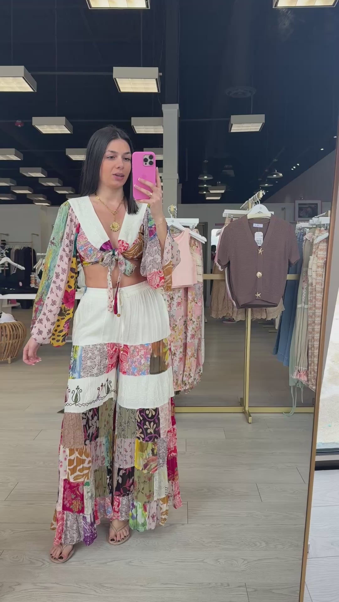 ✨ A true statement set made for sunshine days and golden hour plans. This artisan-inspired patchwork co-ord features a tie-front cropped top paired with flowy, tiered wide-leg pants for that effortless boho feel. Crafted from a lightweight rayon blend, it’s soft, breathable, and moves beautifully with every step. The elastic waist keeps things comfy while the mixed patchwork print gives it that one-of-a-kind, festival-ready vibe 🌞🌿