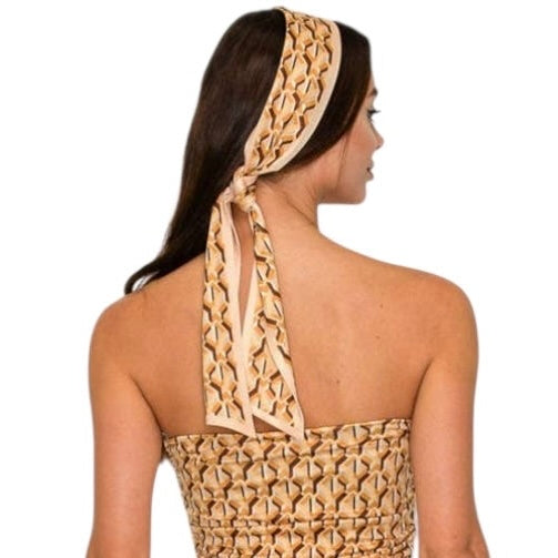 Effortless drama in one piece 🤎 This strapless jumpsuit features an all-over geometric print and an asymmetric scarf accent that makes it feel styled without even trying. The ruched waist detail enhances your shape, while the soft, highly stretchable fabric keeps it comfortable from day to night. Matching headscarf included.