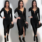 Your go-to black midi just got an upgrade 🖤 This deep V-neck silhouette with shirring detail and a sultry front slit gives effortless glam. Made with stretchy fabric for the perfect fit that feels as good as it looks.
