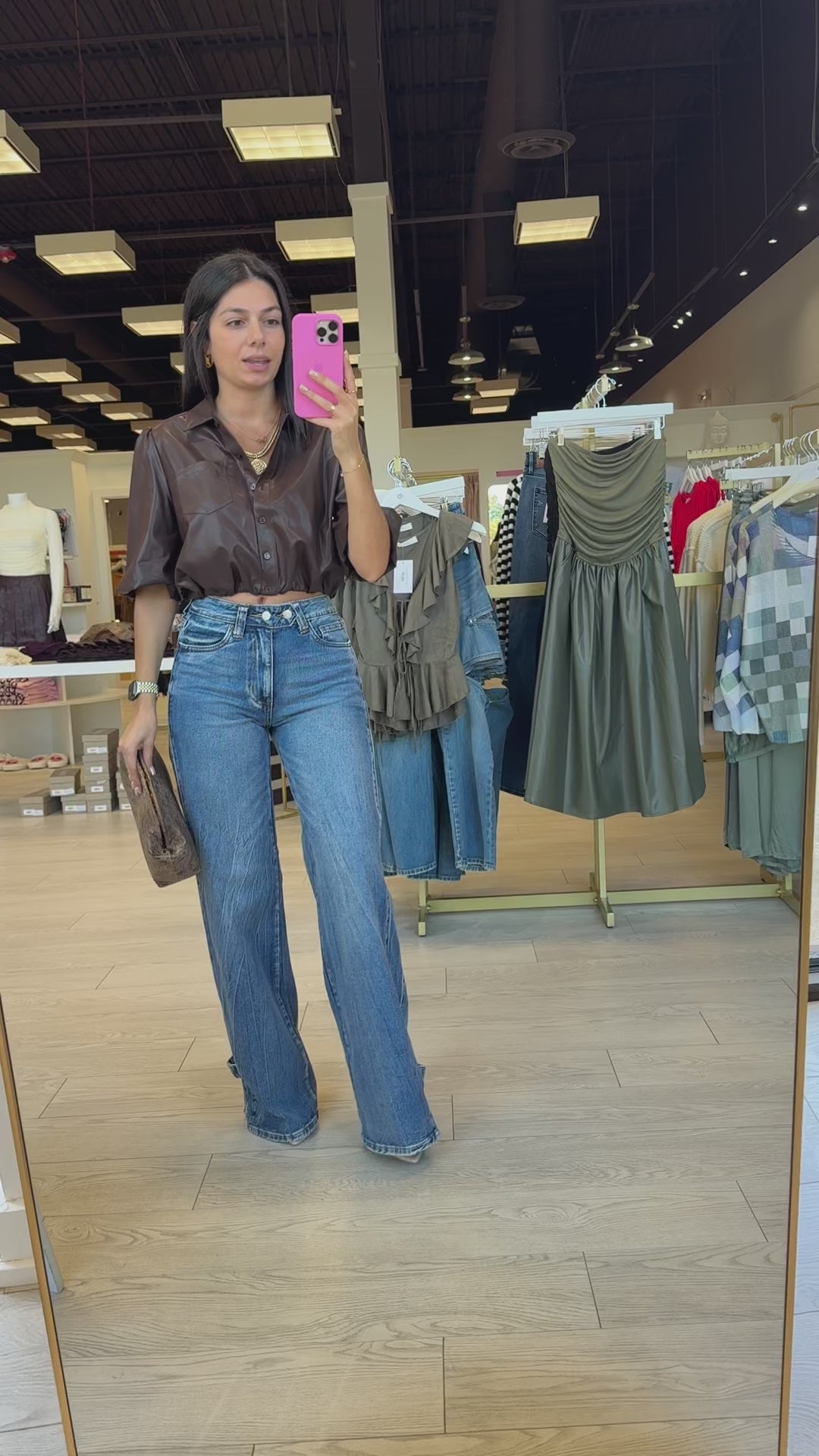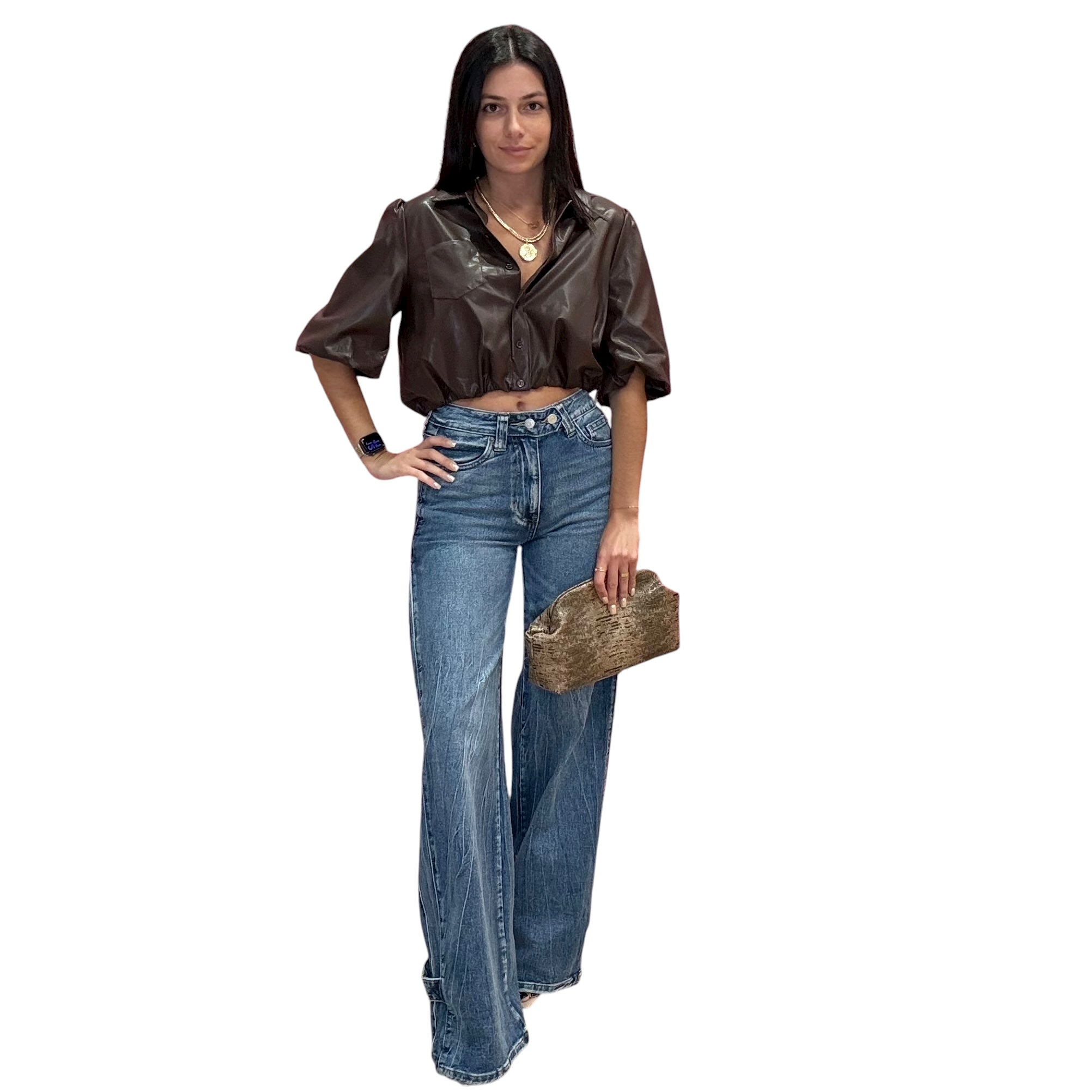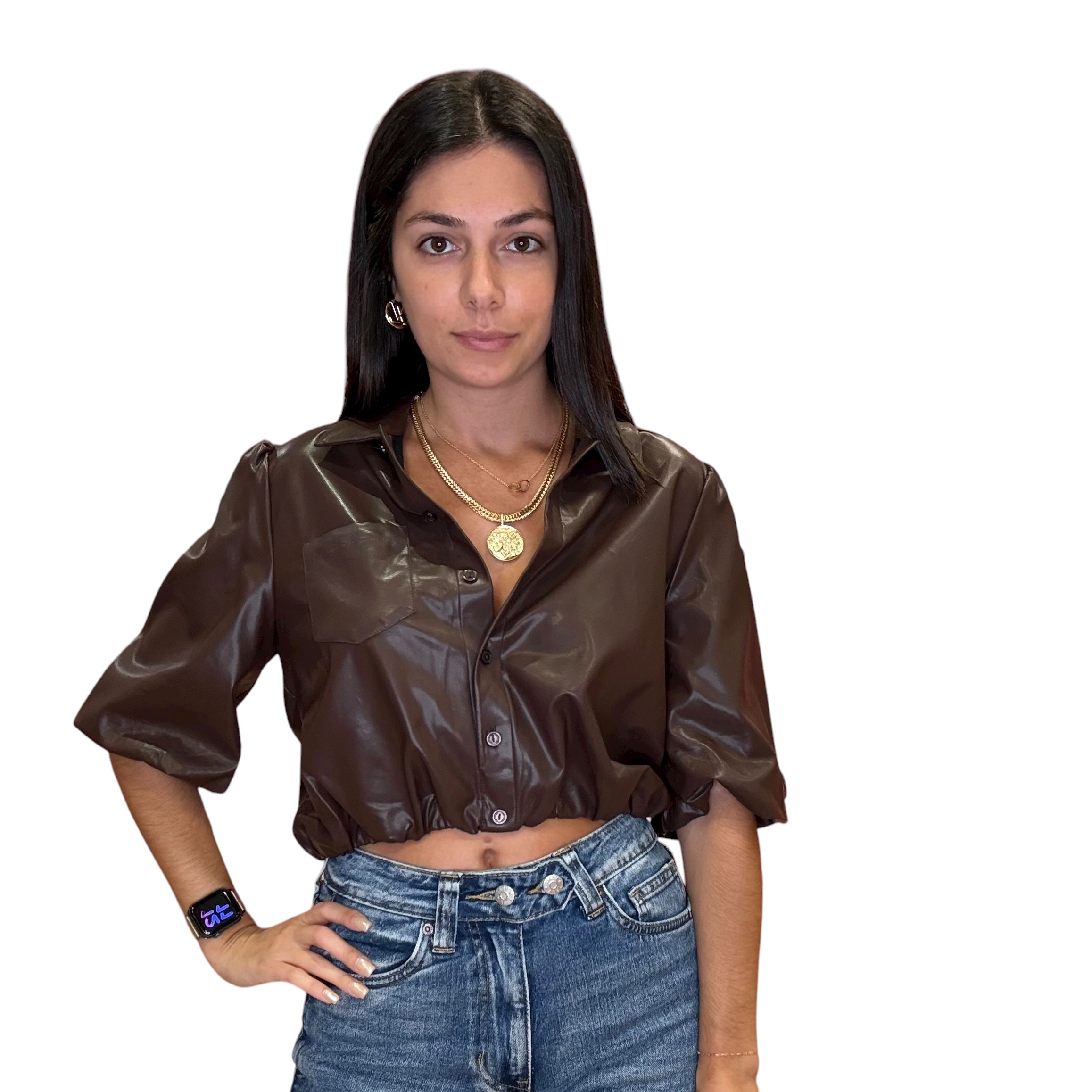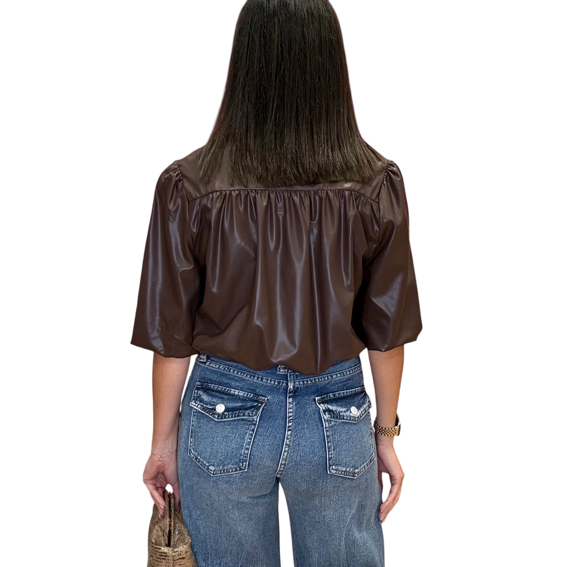 Rich chocolate vegan leather, cropped cut, and sharp tailoring make this blouse your new statement piece. Smooth, glossy texture adds instant polish.