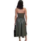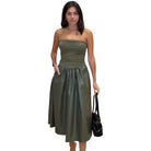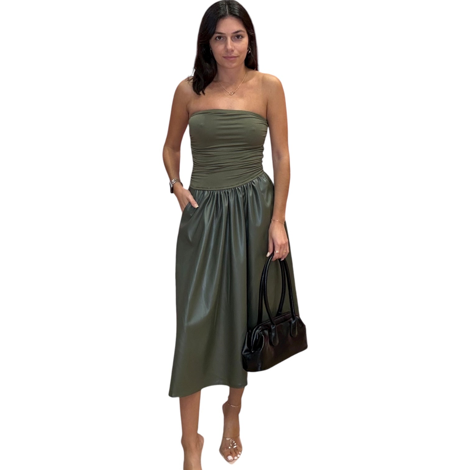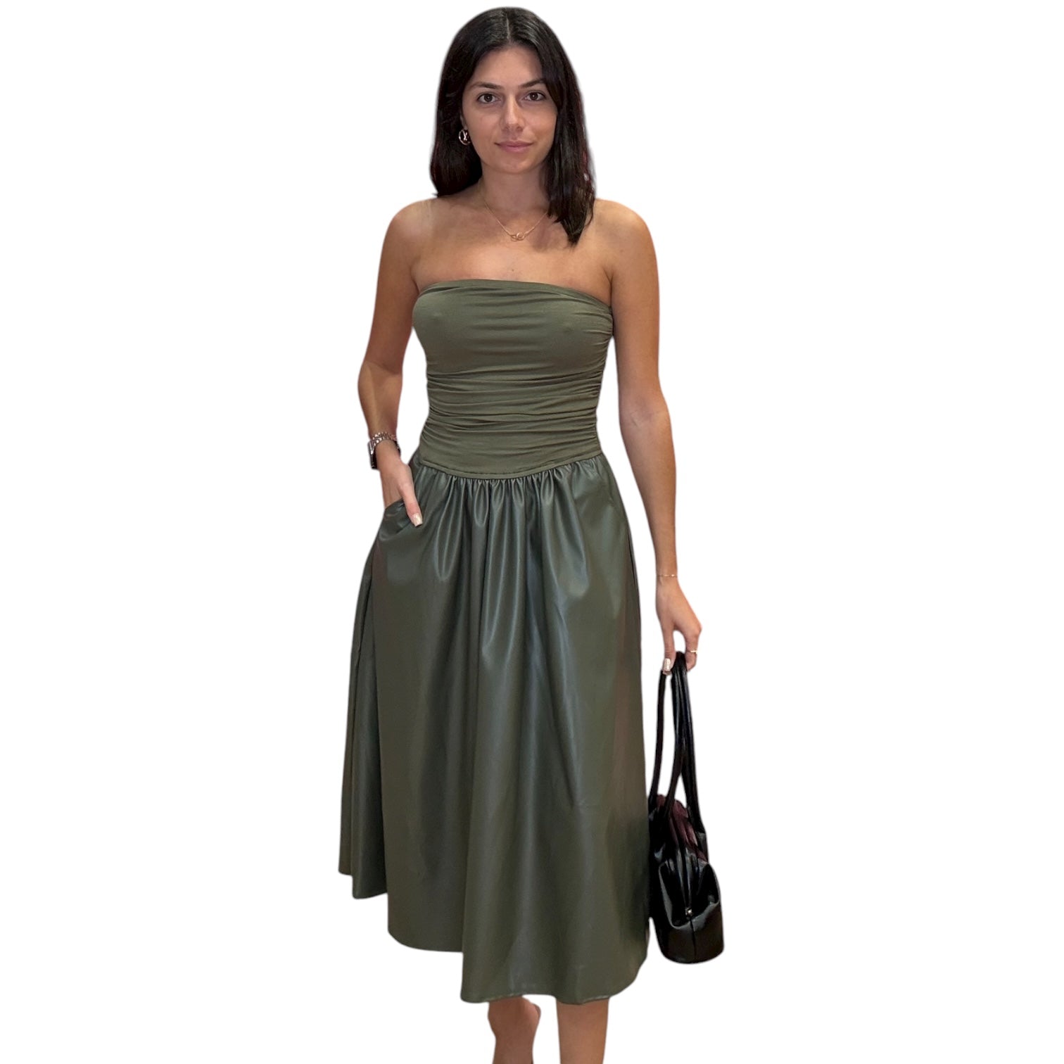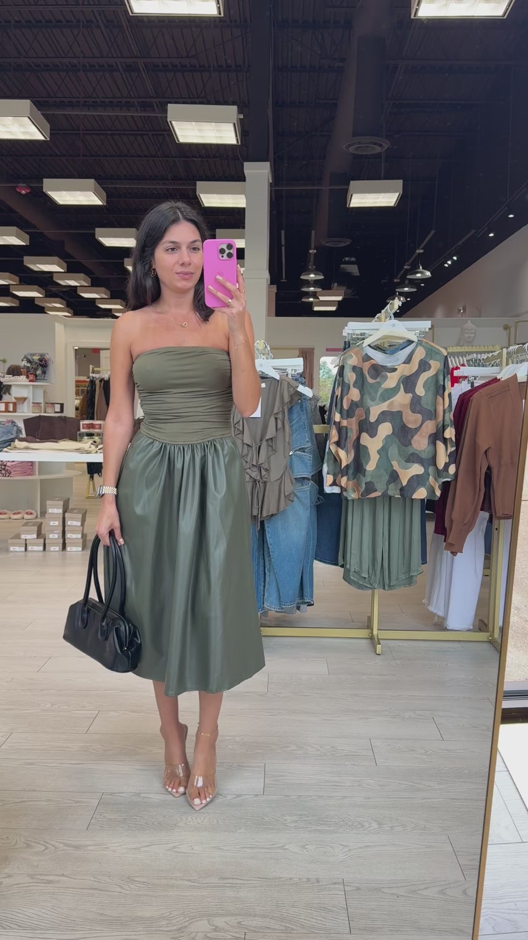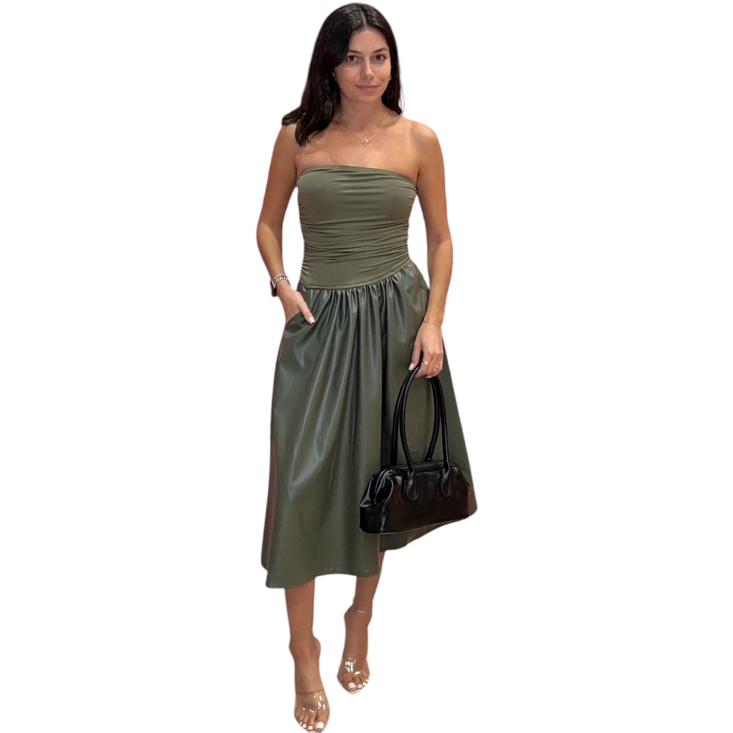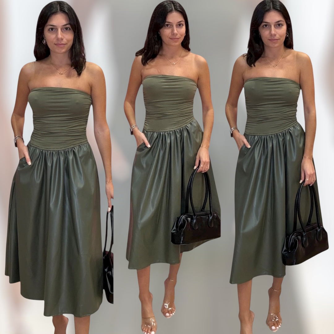 A figure-hugging tube dress crafted in vegan leather with a sleek midi length and hidden side pockets (yes, pockets!). The strapless cut makes it a versatile piece that works for both night-out glam and layered day styling.