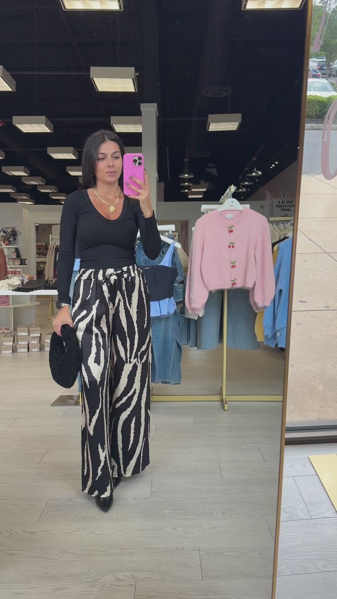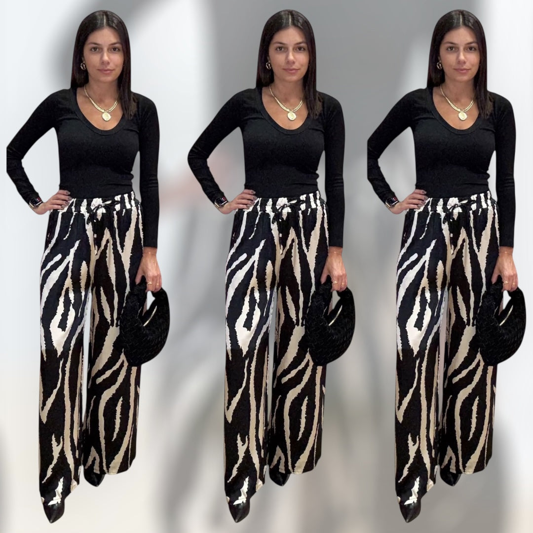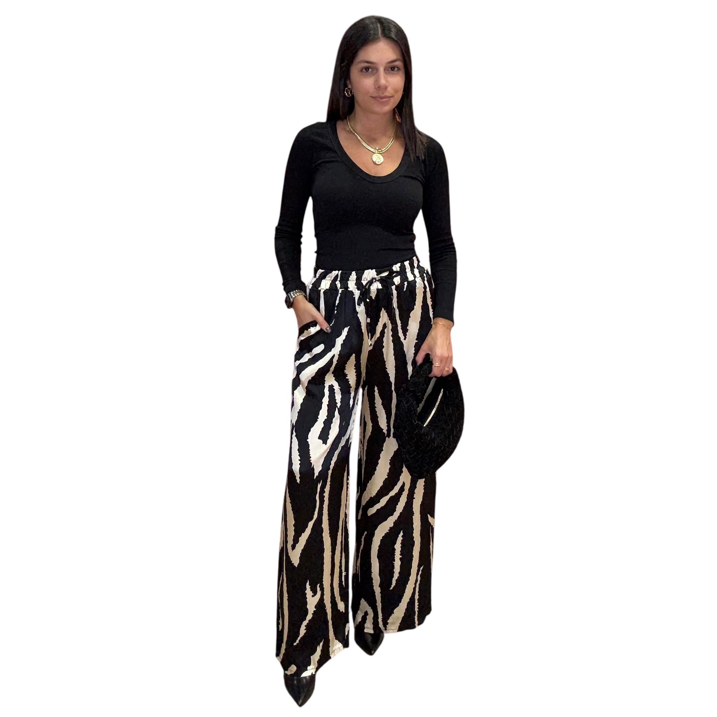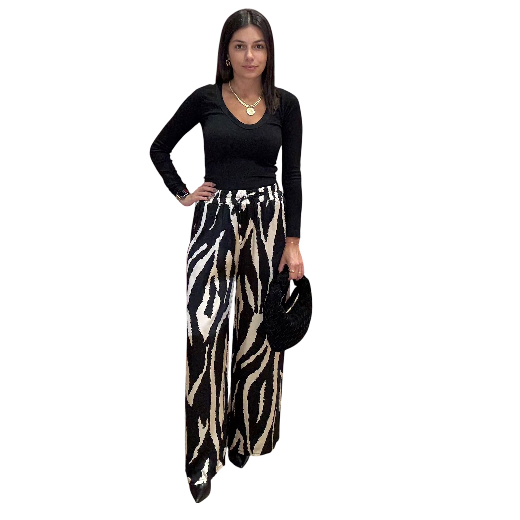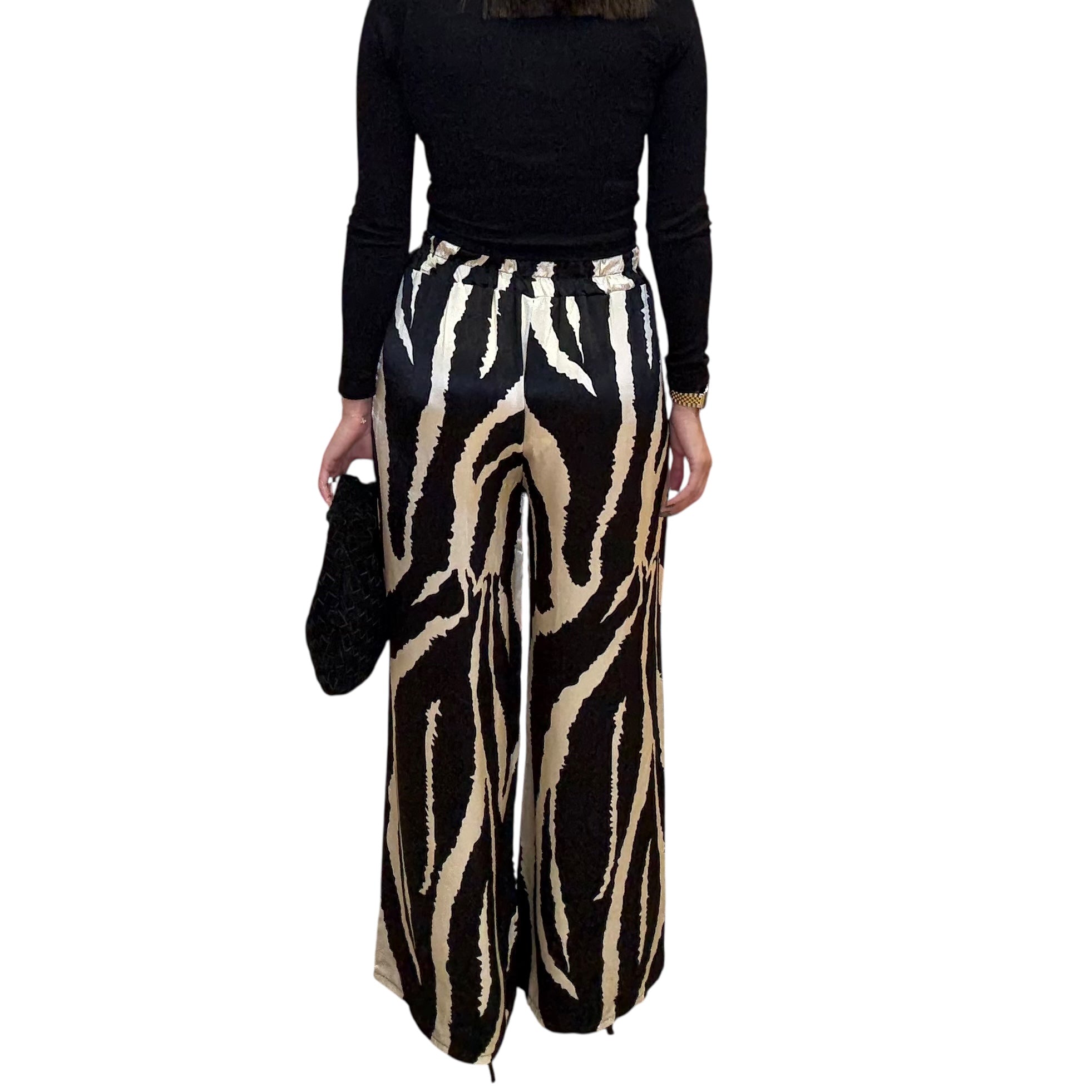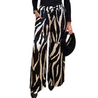 Bold yet effortless, the Zebra Wide-Leg Pants bring instant statement style. Made in Italy from lightweight viscose, these flowy pants feature a striking black-and-beige zebra print with pockets for function and flair.