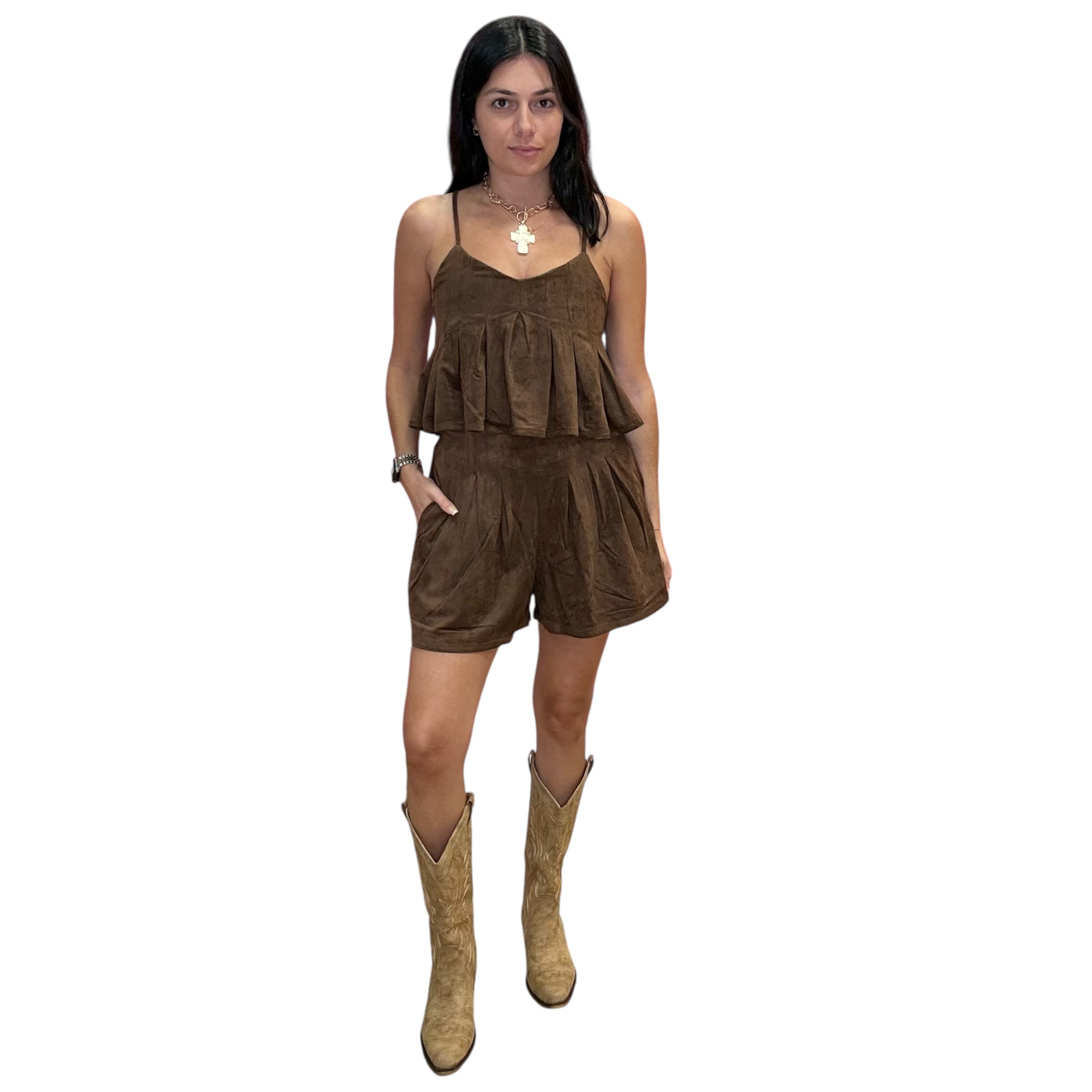 Suede Pleated Shorts Set – Brown