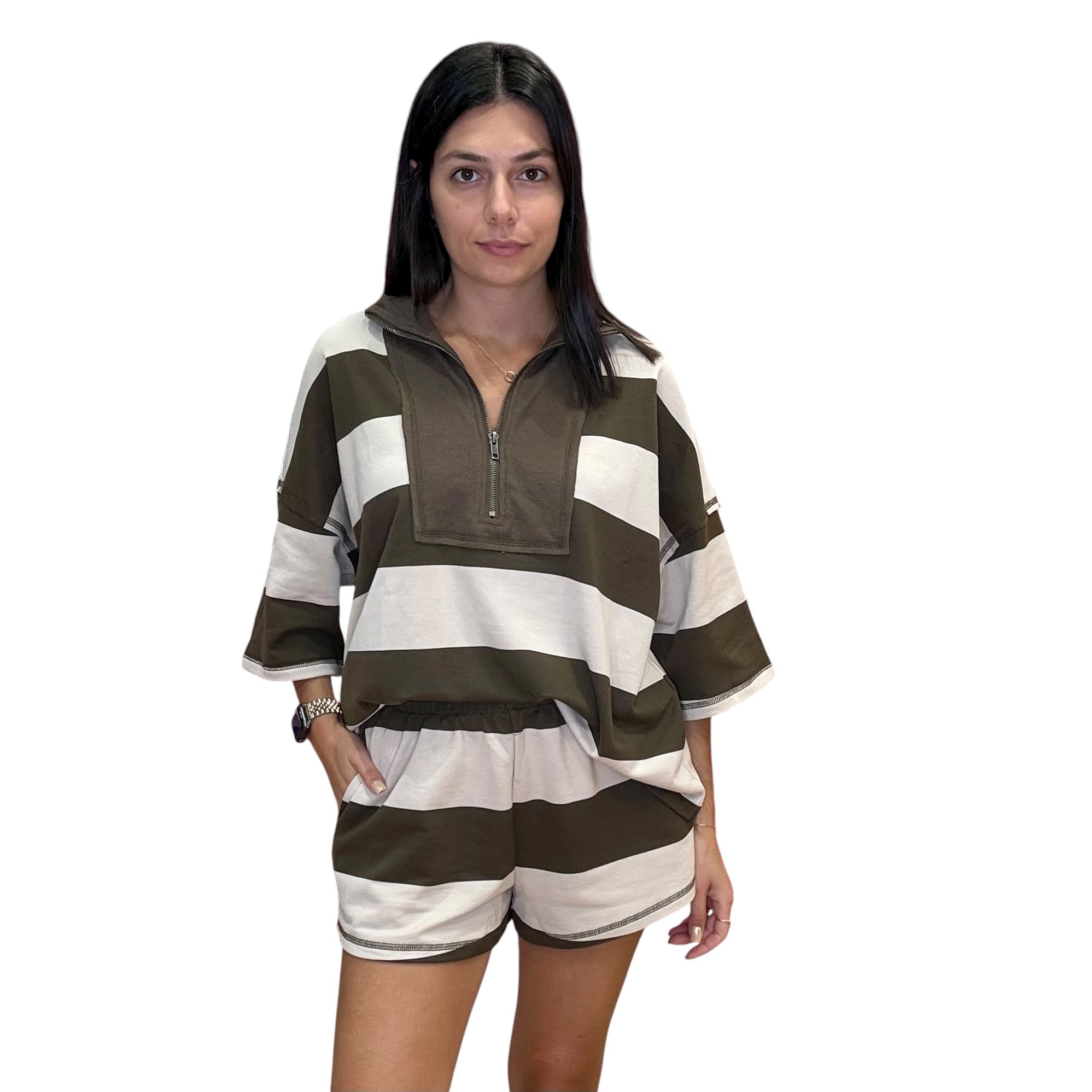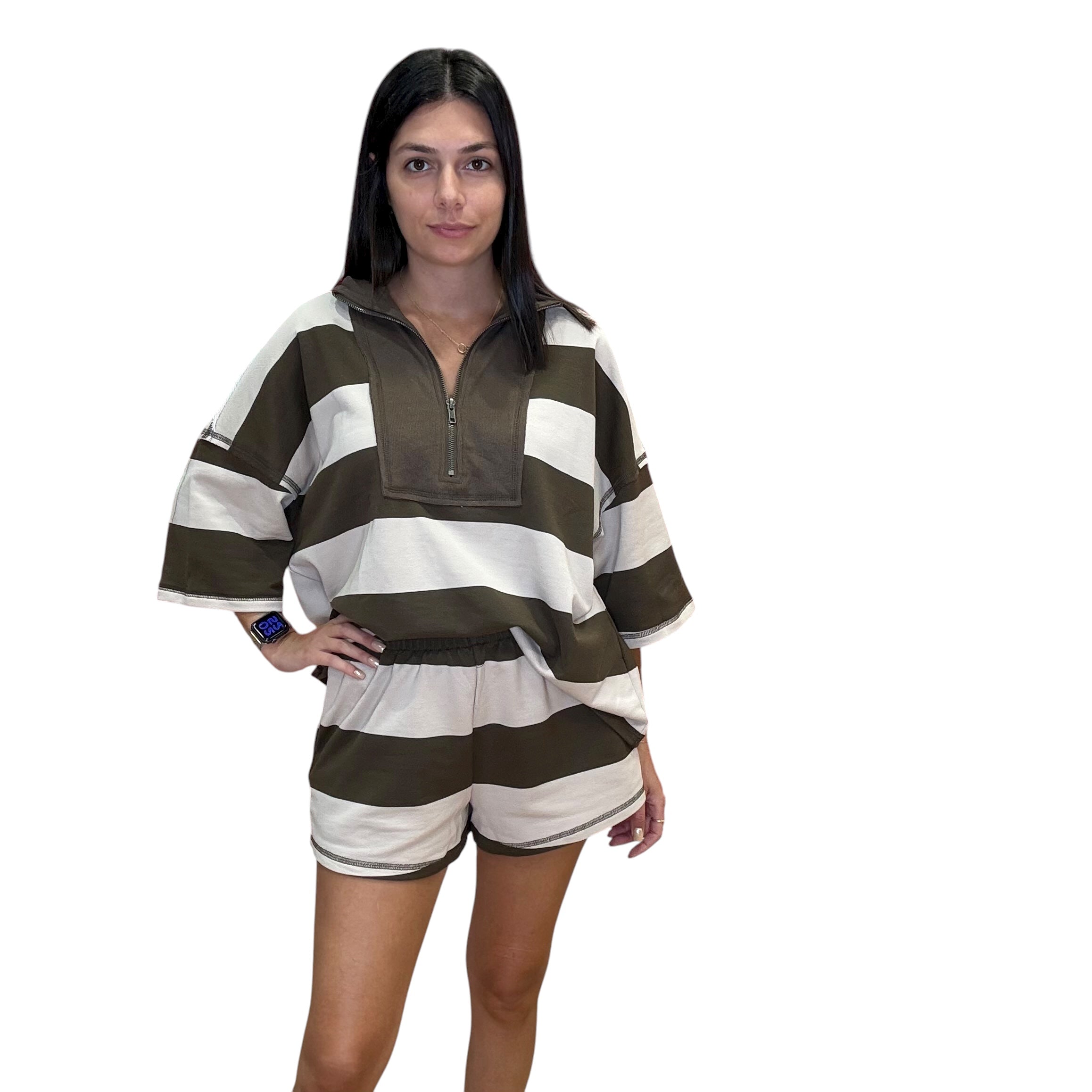 Chic and laidback, this brown-and-cream striped set features an oversized zip-up hoodie and matching elastic-waist shorts. Soft, breathable, and perfect for coffee runs or cozy nights in.