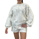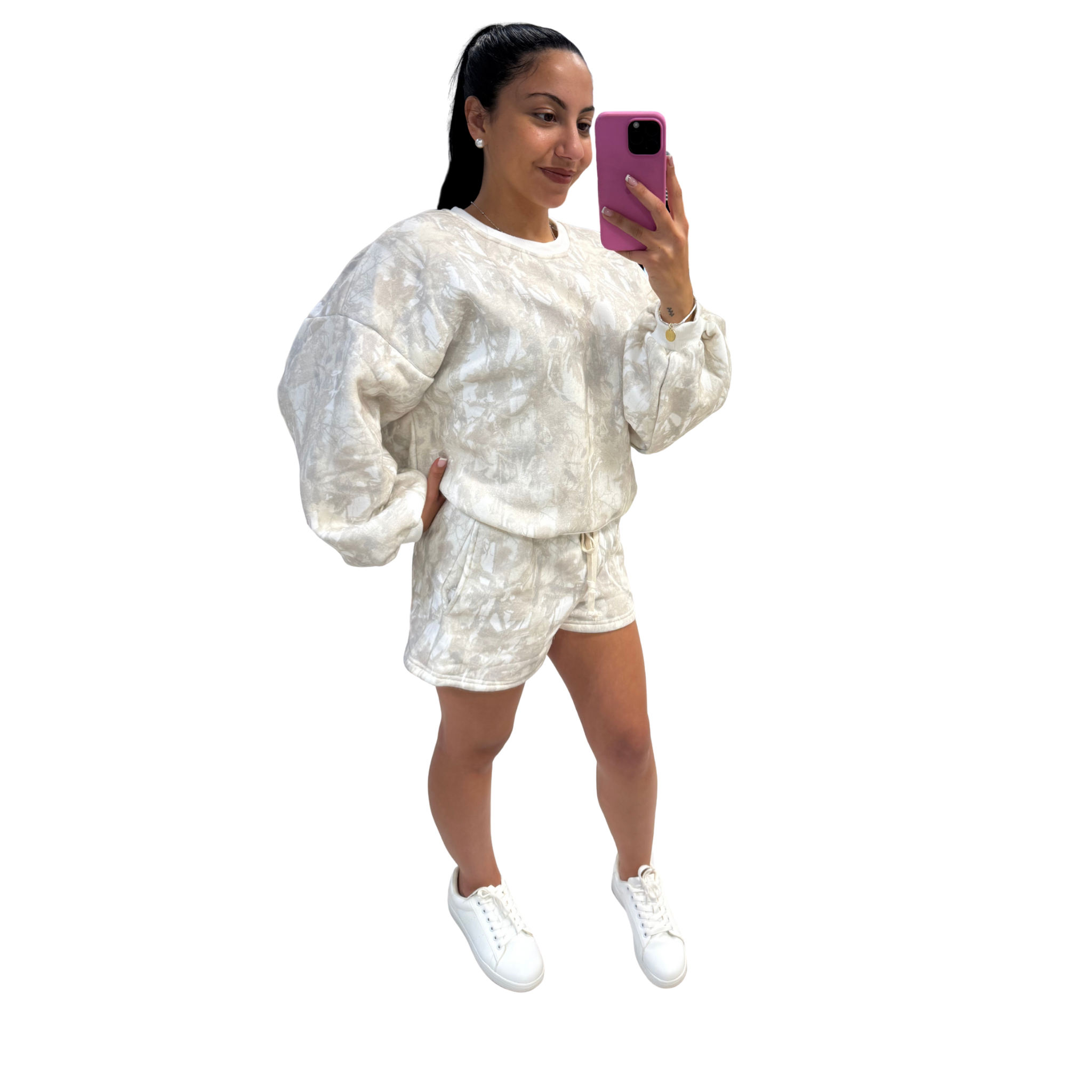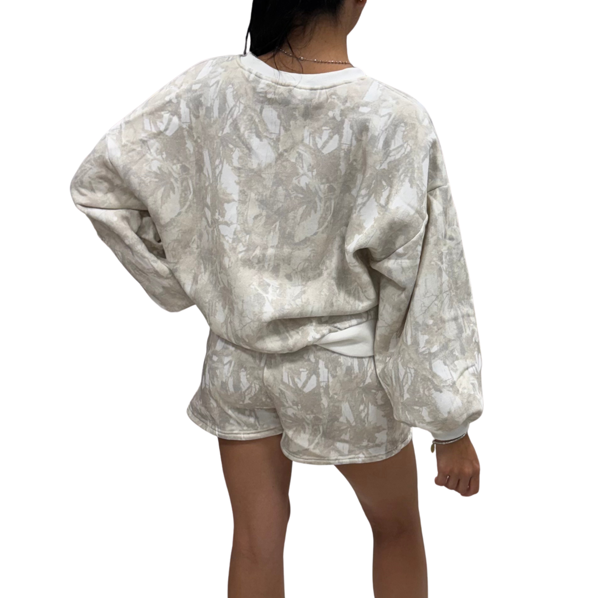 Soft, slouchy, and street-chic 🌲 This neutral camo set includes a cozy crewneck sweatshirt and matching drawstring shorts. Made for lounging, errands, or layering up, this set blends comfort and cool effortlessly.