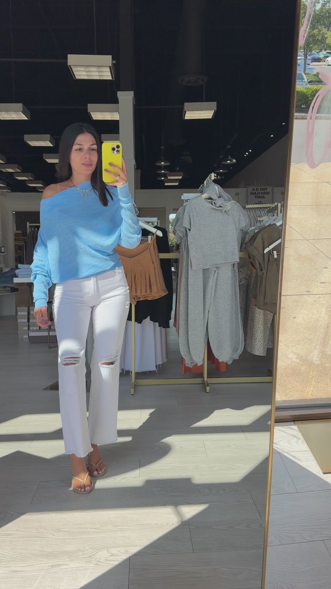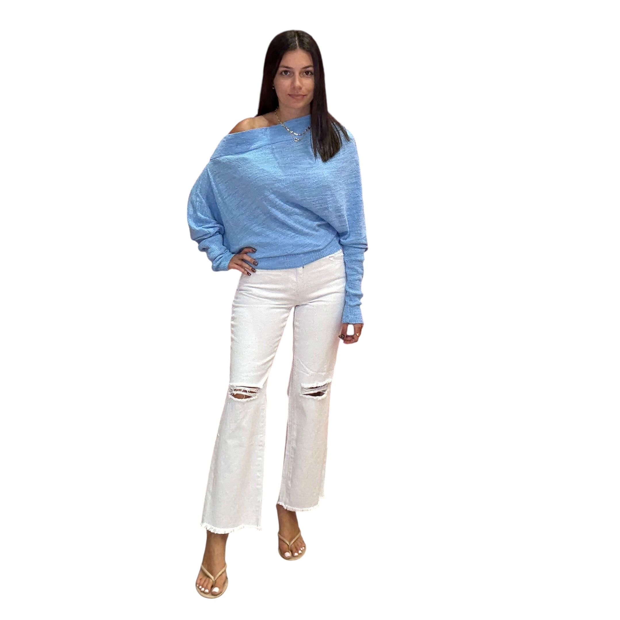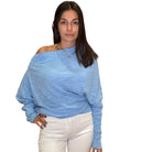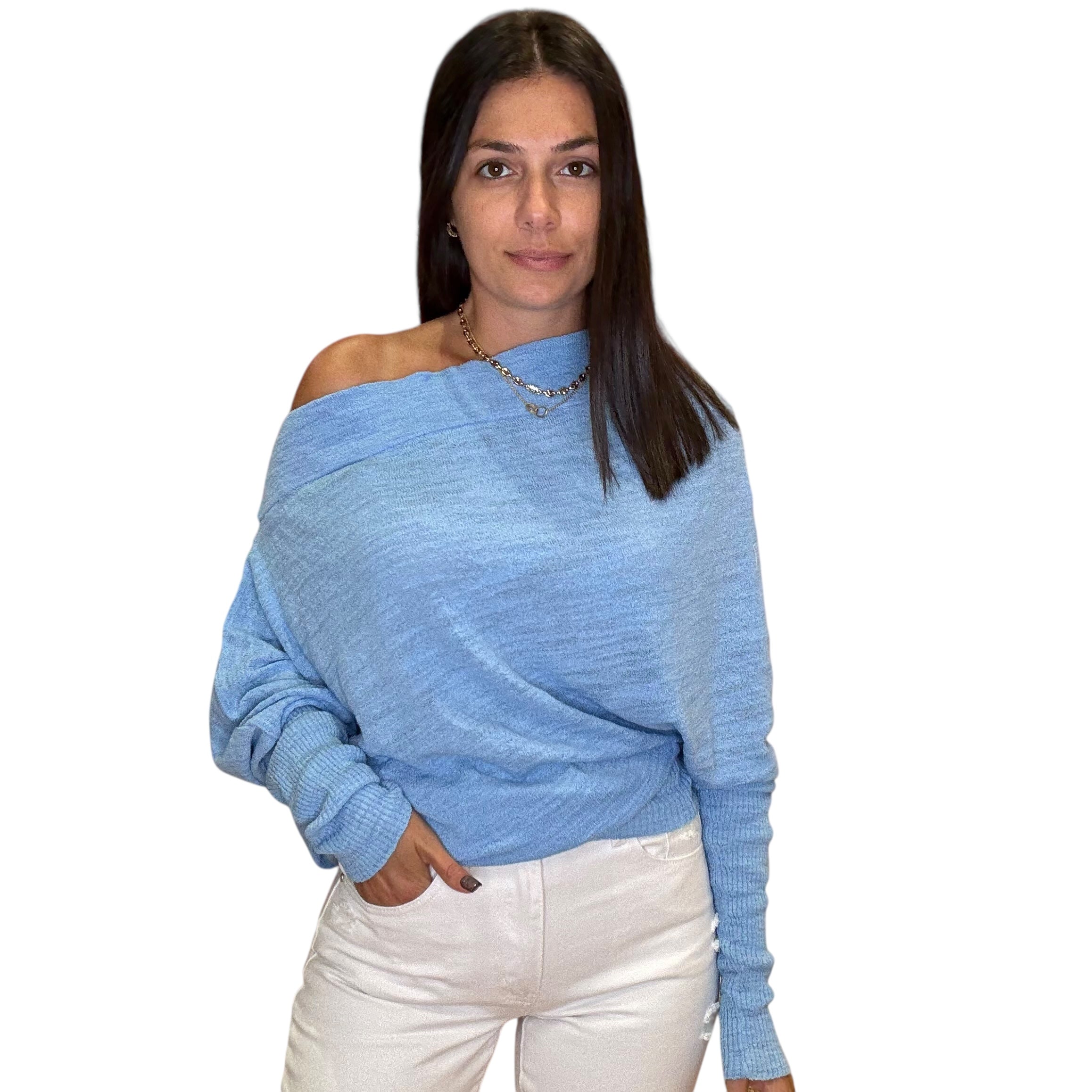Asymmetrical + slouchy chic. This periwinkle slub knit sweater features a one-shoulder neckline with dolman sleeves for an effortlessly cool vibe. The soft ribbed trim makes it equal parts cozy + elevated.
