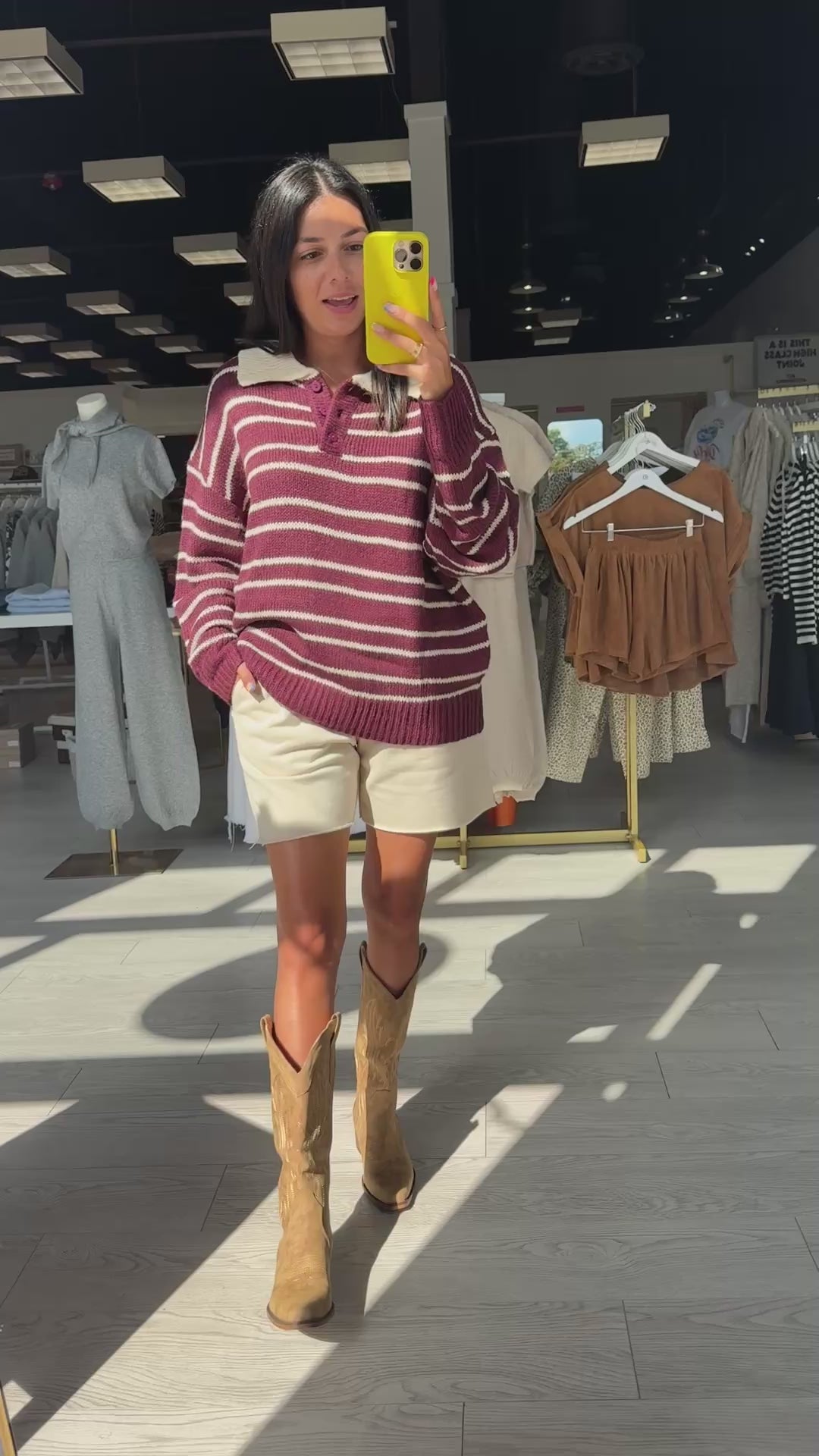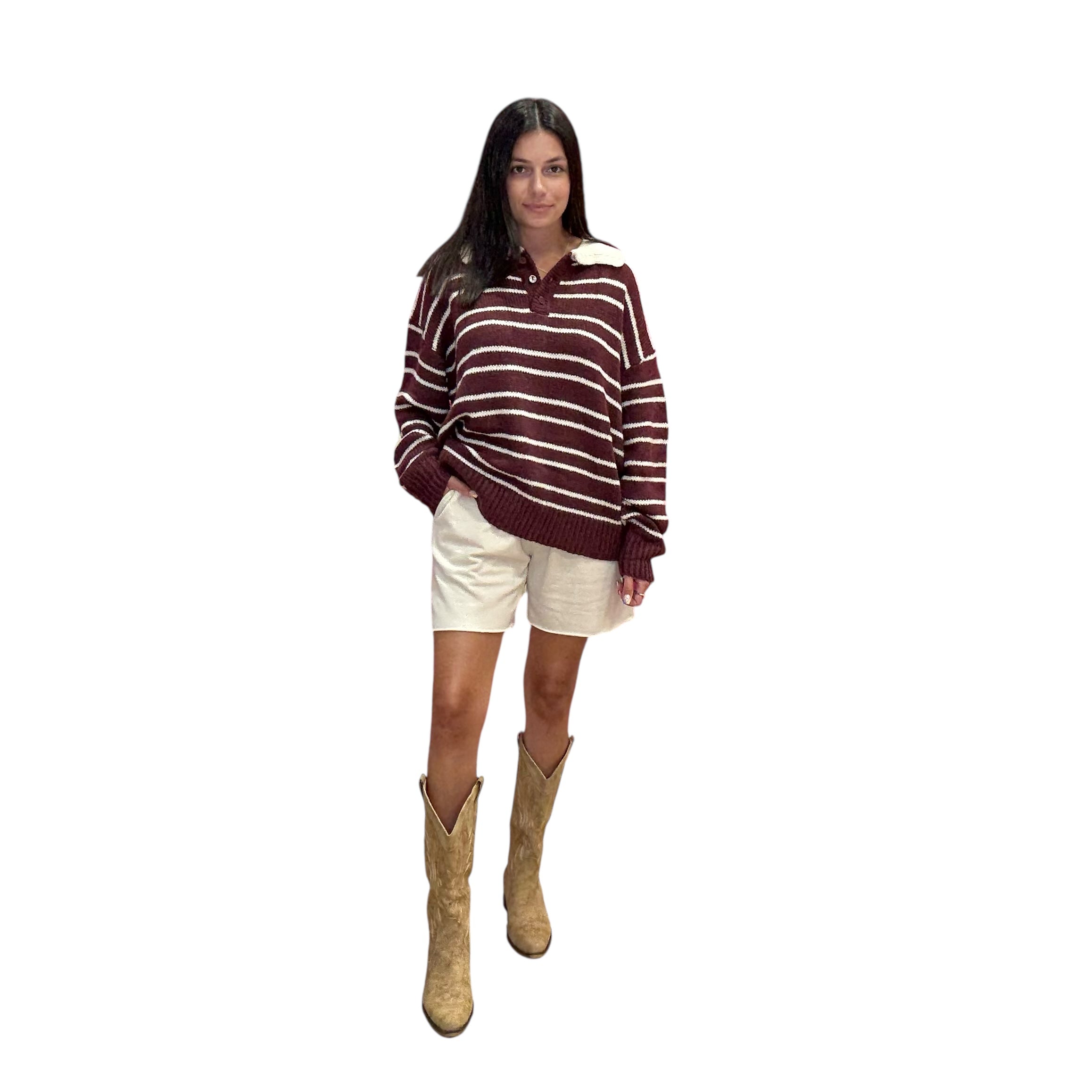 Cozy up in this varsity-inspired striped sweater in a deep burgundy hue with a contrast collar. Made from a luxe blend of acrylic, nylon, and wool, it’s soft, warm, and perfect for layering. The slightly oversized fit gives you that comfy-chic vibe for everything from errands to fall hangs.