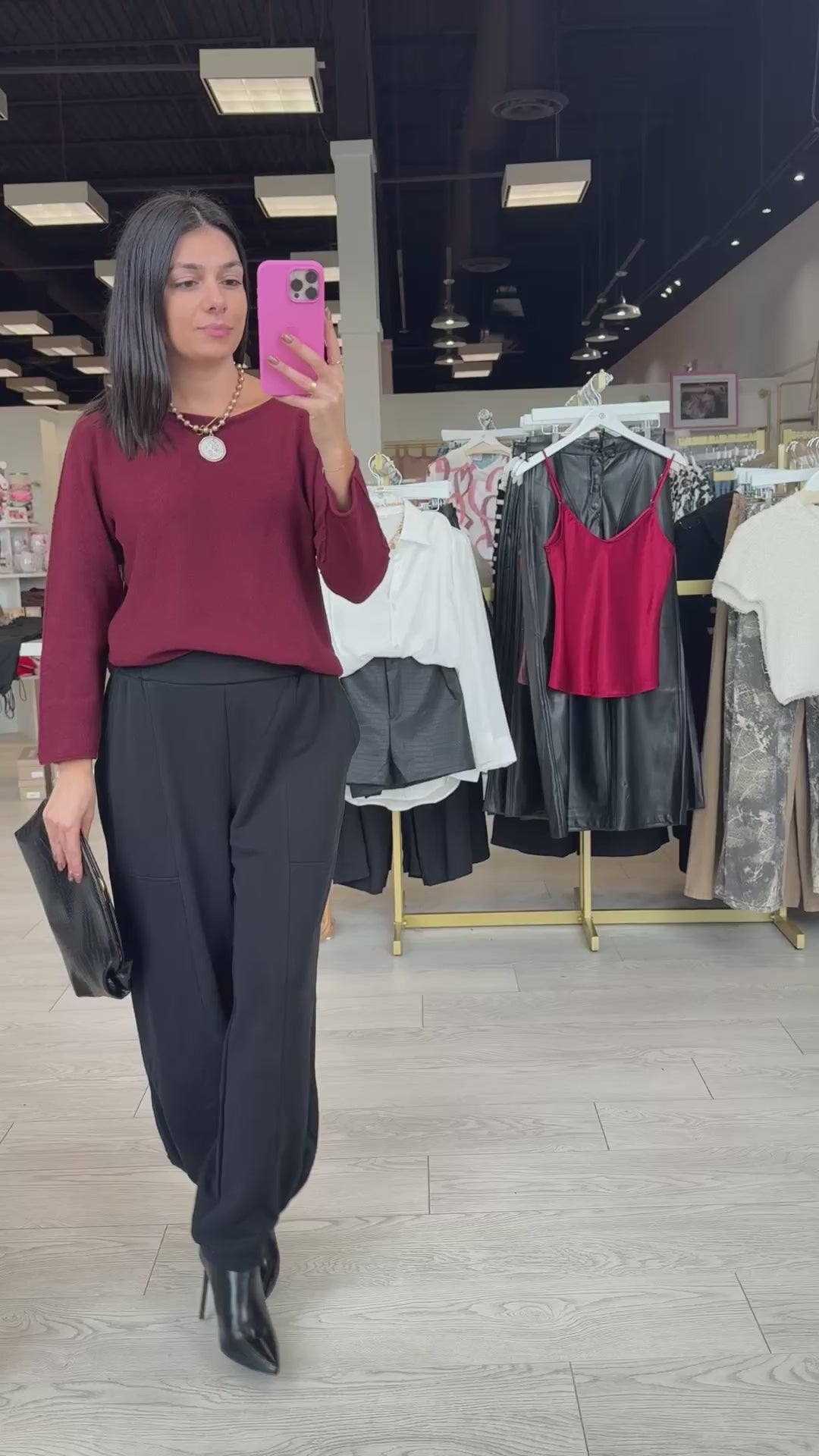 A little luxe, a little laid-back — this Italian round knit sweater in dark wine is soft, cozy, and so wearable. The one-size fit gives that perfect drape, making it ideal for layering all season long.