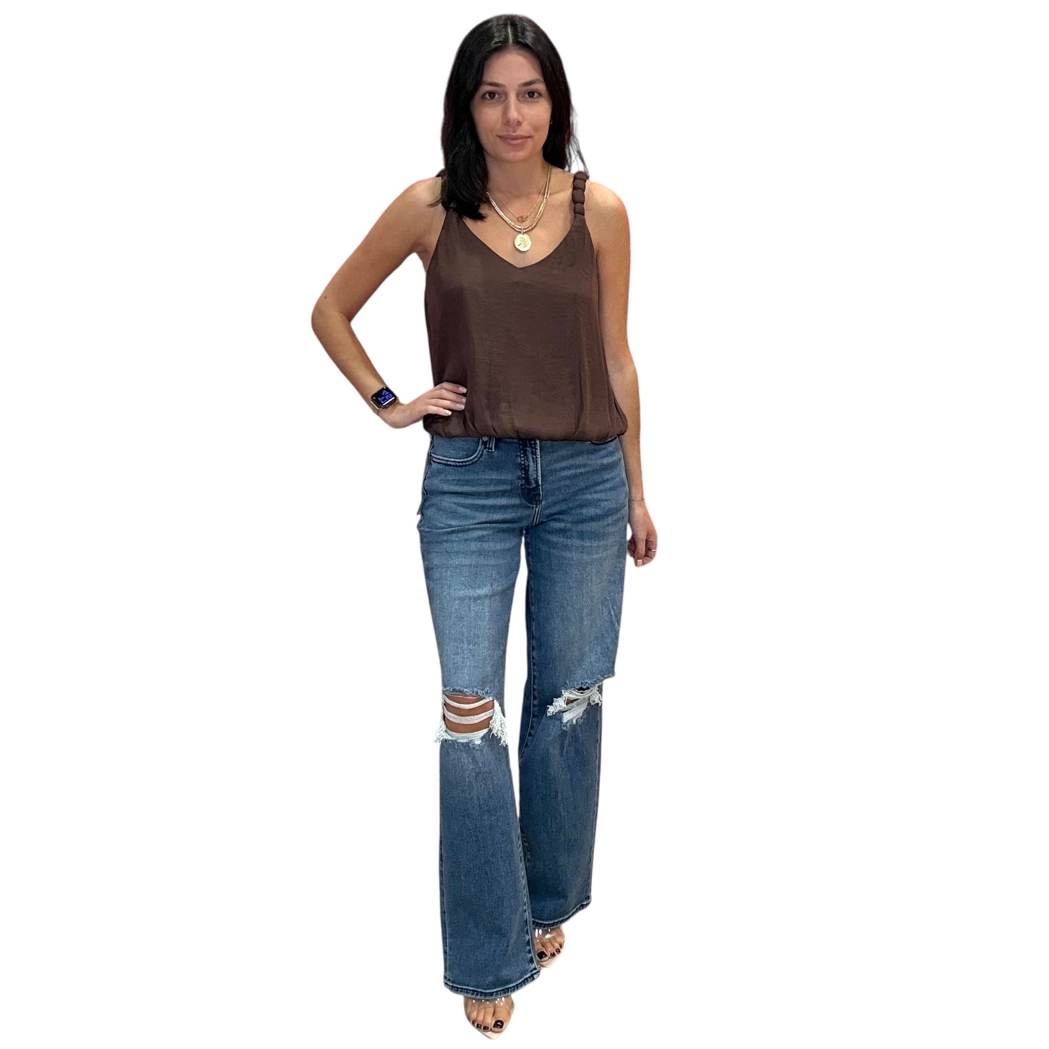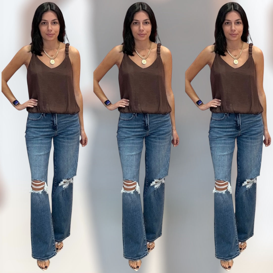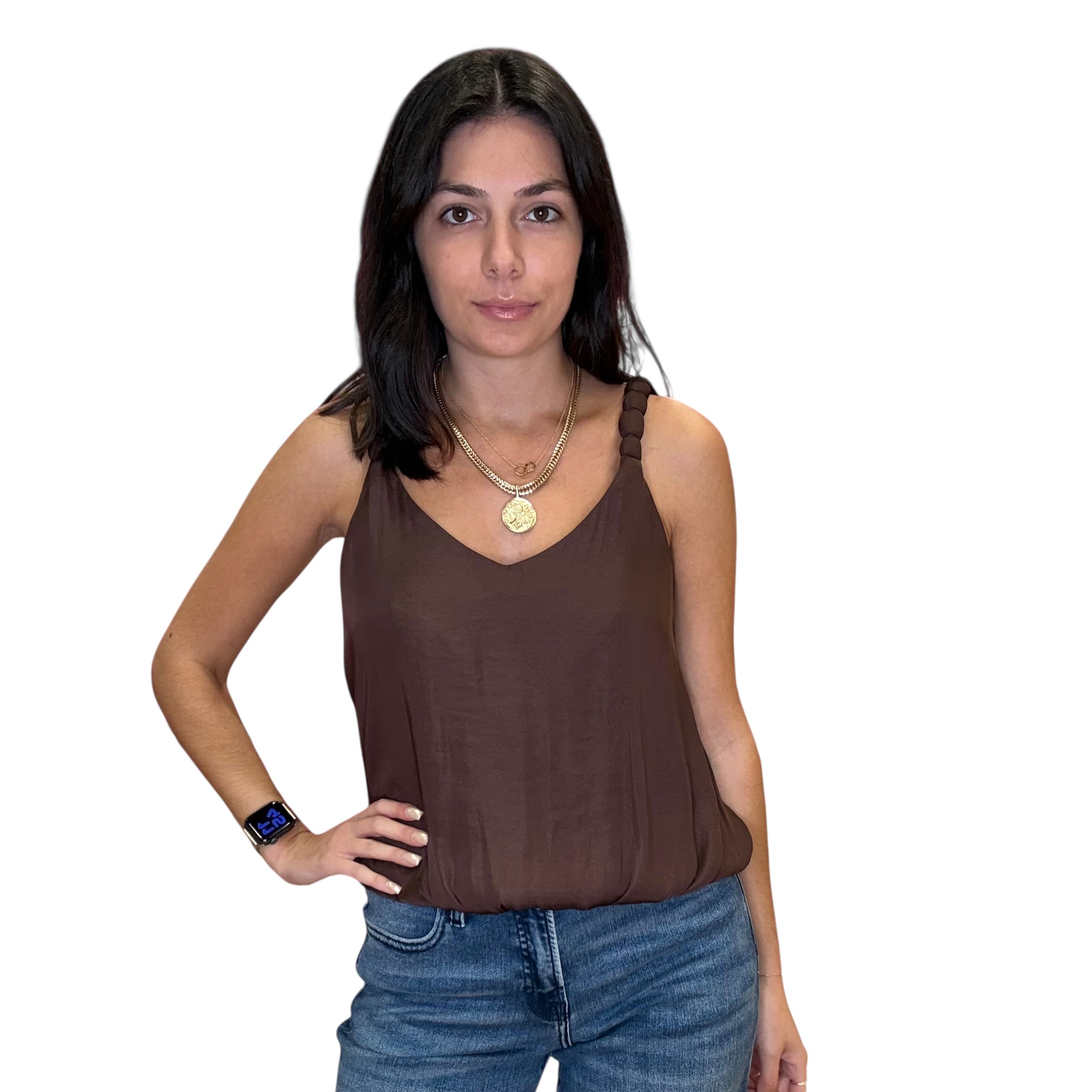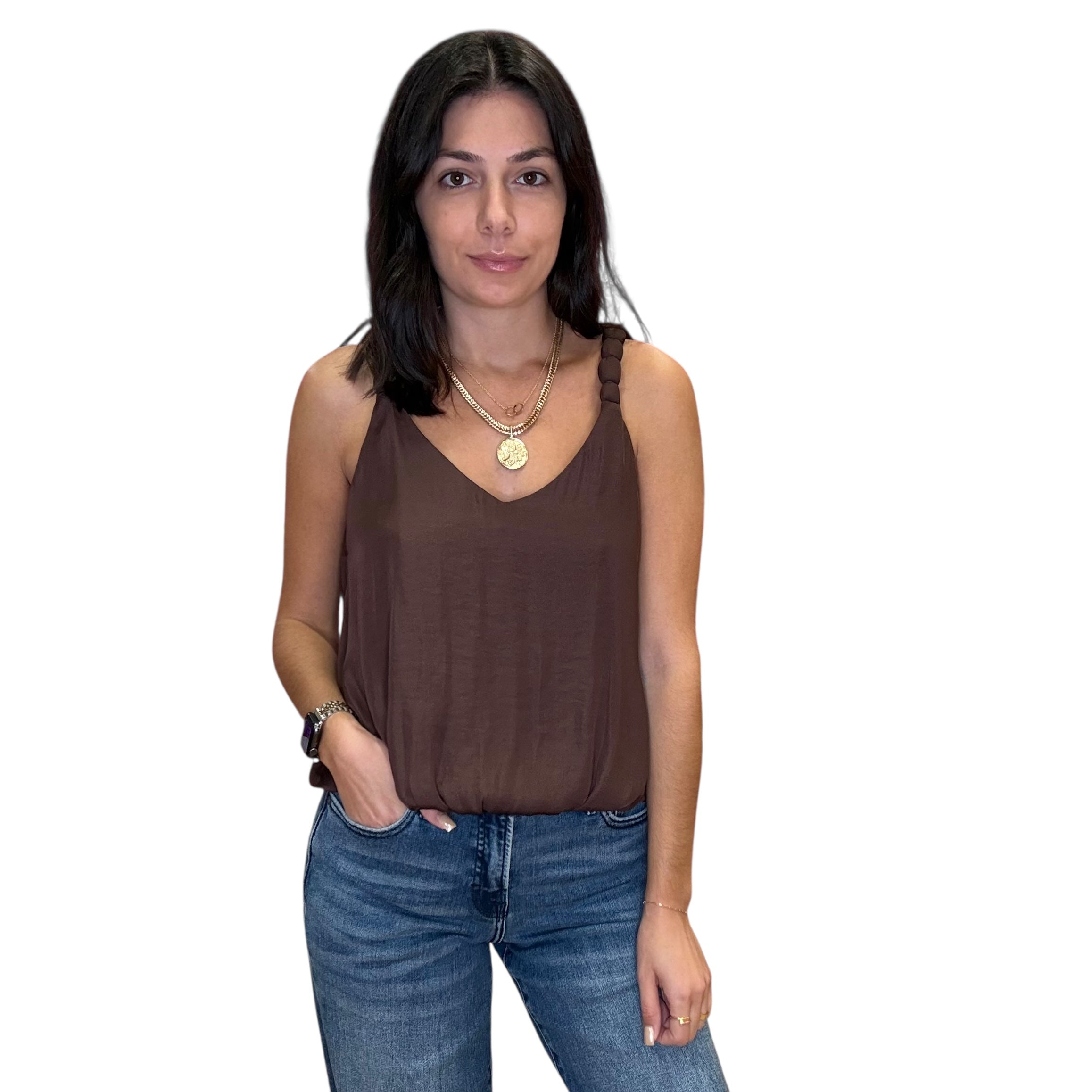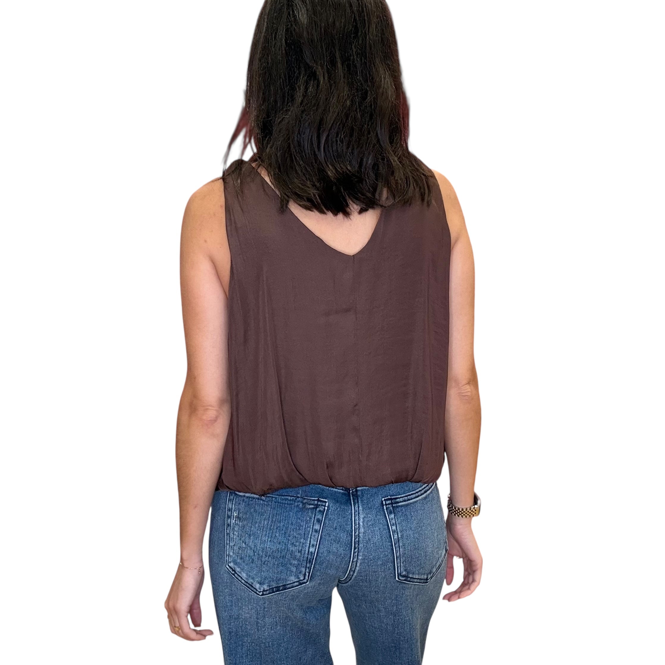 Soft chocolate satin tank with airy billowy straps and a luxe flow. Chic, minimal, and easy to dress up or down.