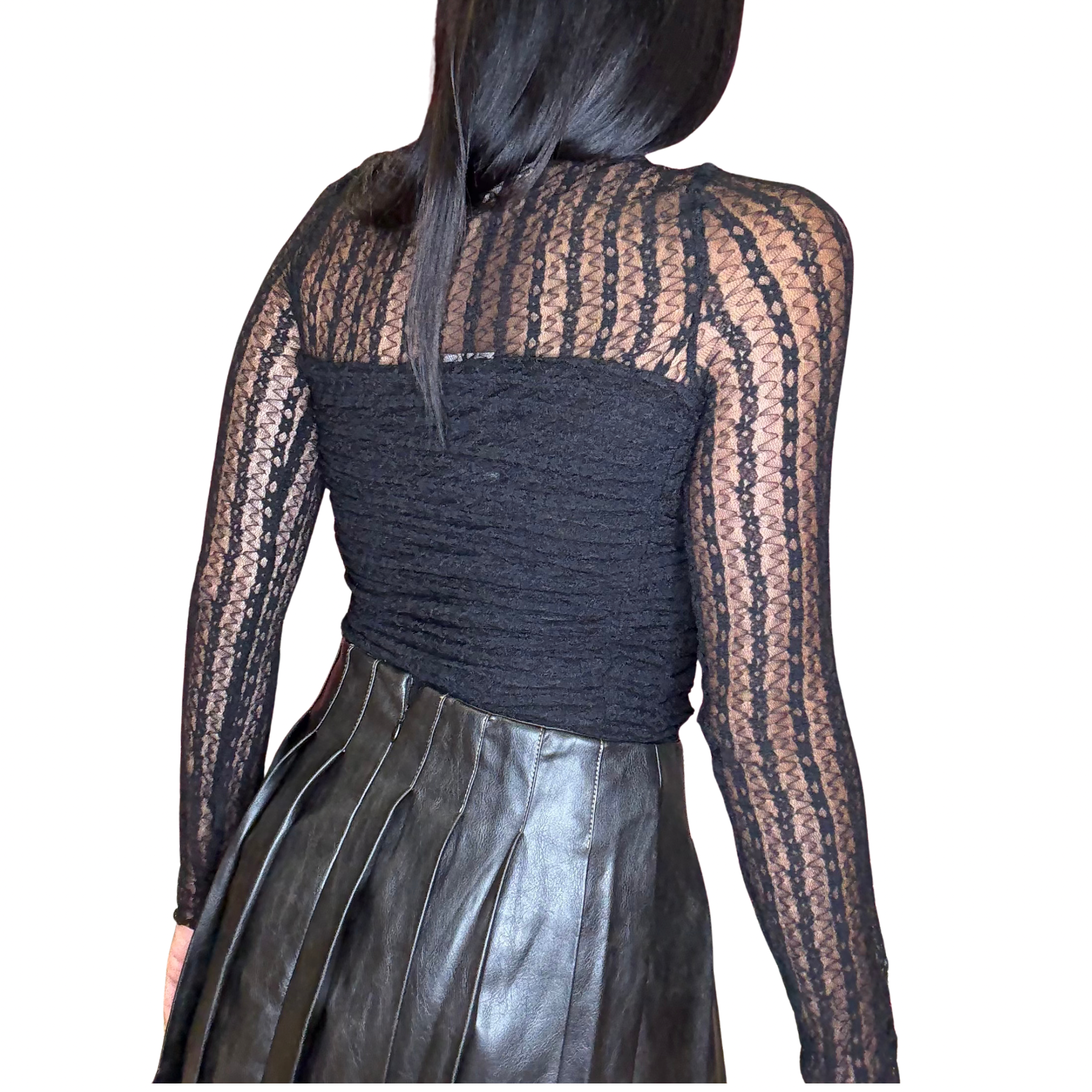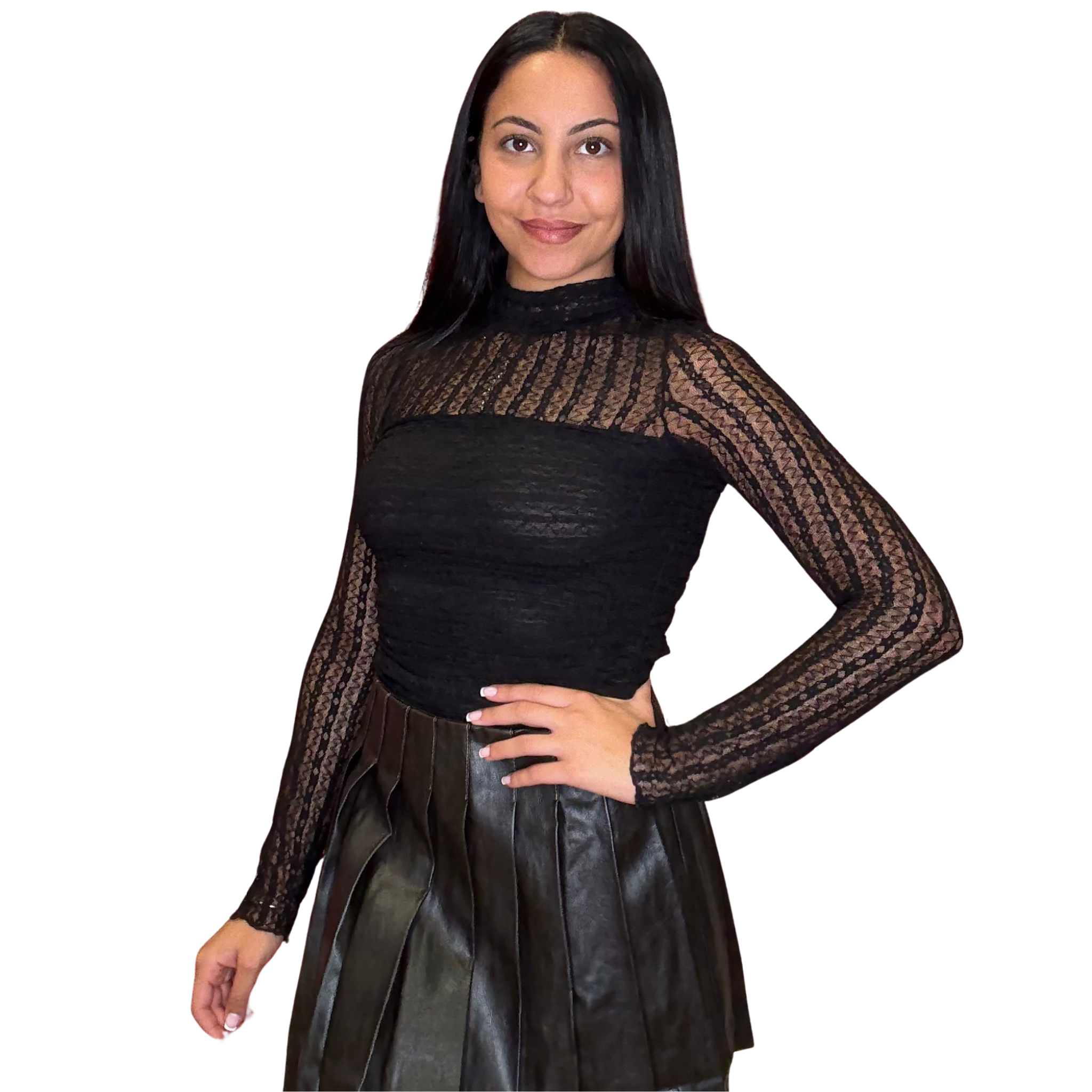 Delicate lace meets a sleek, fitted silhouette in this ruched bodysuit. Featuring a high mock neck, long sleeves, and a body-contouring fit, it’s romantic yet sultry. Perfect for layering or making a statement all on its own.